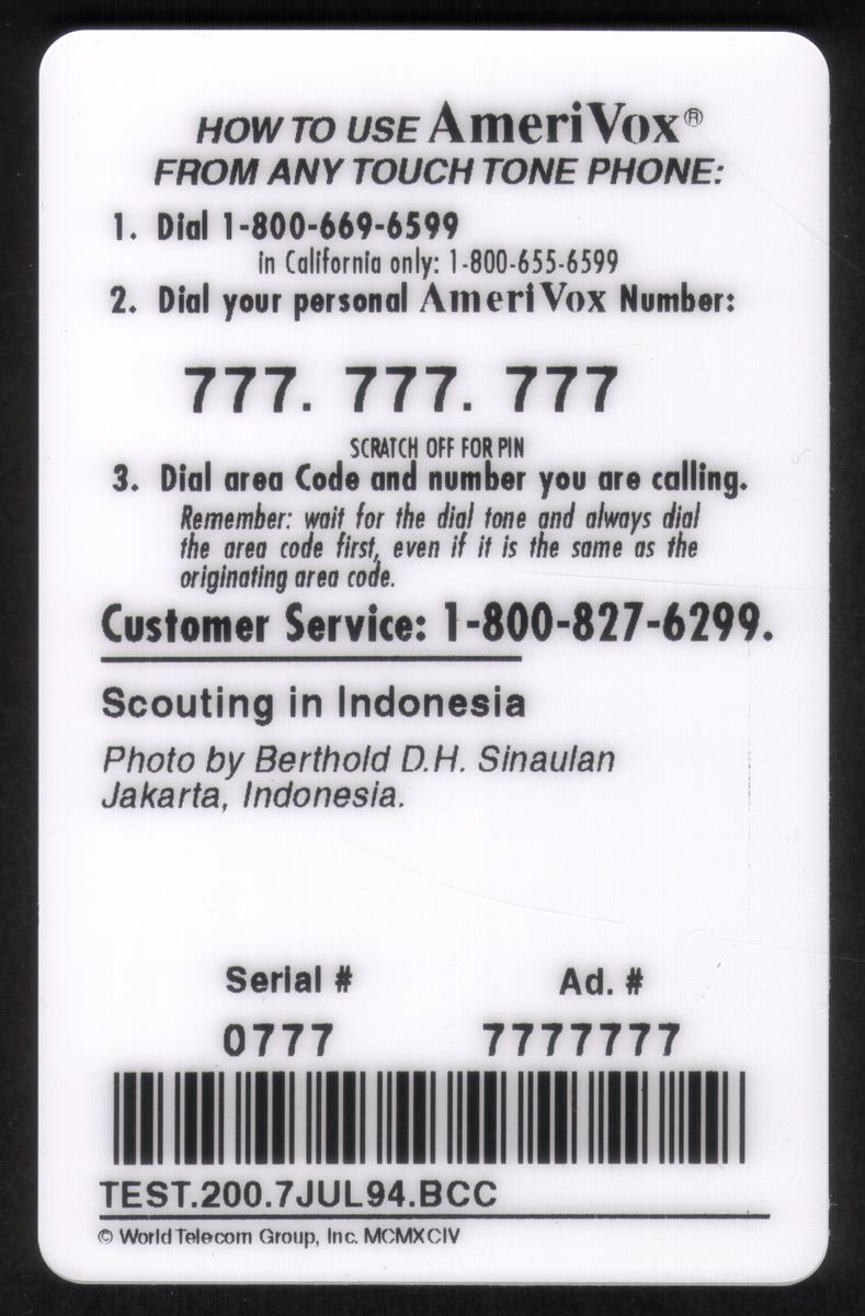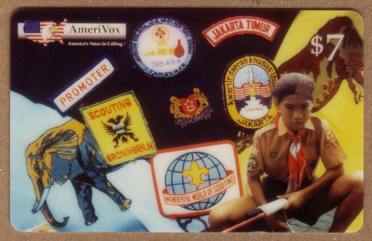 This phone card presents a vivid tribute to scouting culture with a strong focus on Indonesian scouting region Jakarta Timur, merit badges, animal symbolism, and the spirit of promotion within the scouting community. It is part of the AmeriVox series and visually integrates scouting emblems, a boy scout’s portrait, and global scouting motifs in a colorful, dynamic layout.