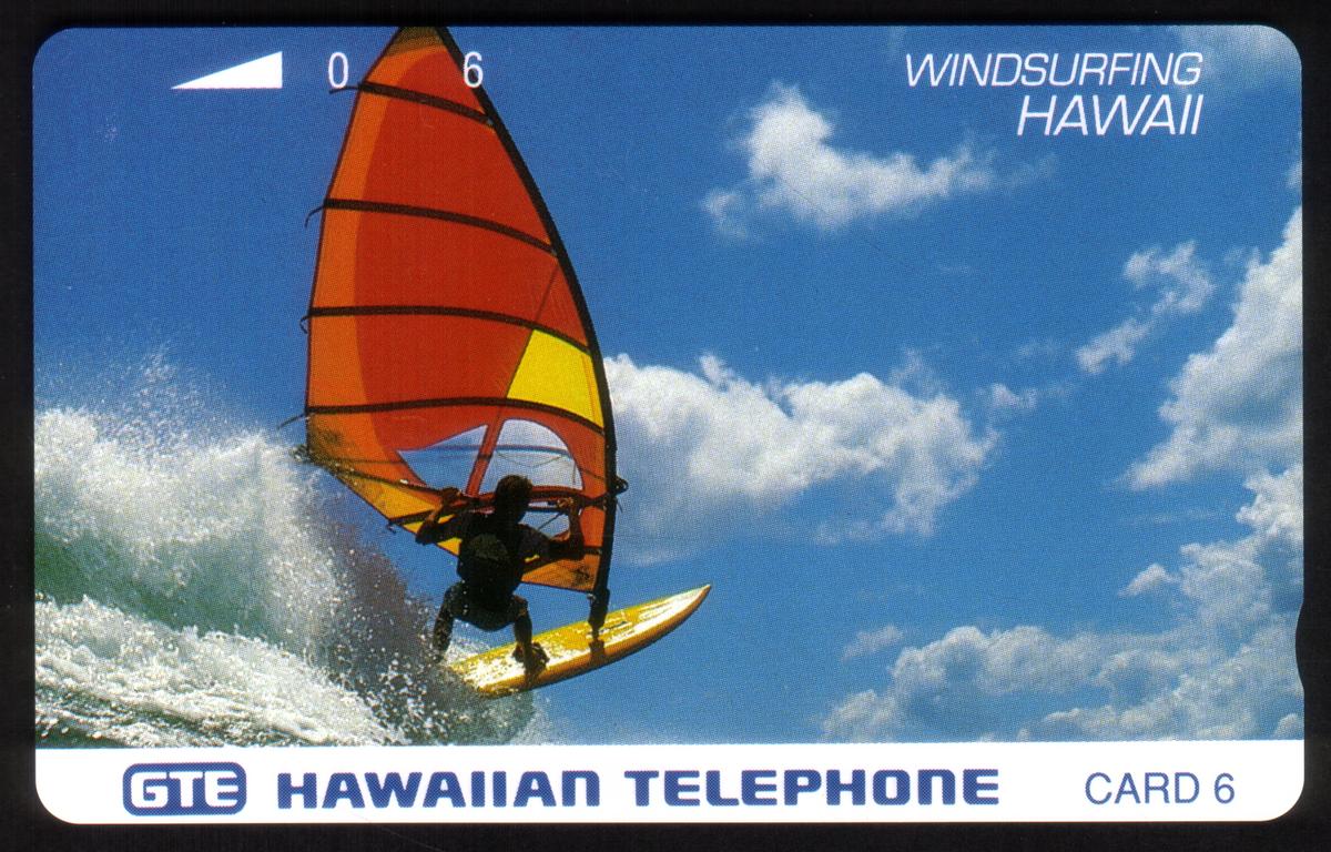 This card visually celebrates watersports, specifically windsurfing in Hawaii, with its dynamic and colorful depiction of the activity paired with clear branding from GTE Hawaiian Telephone.
