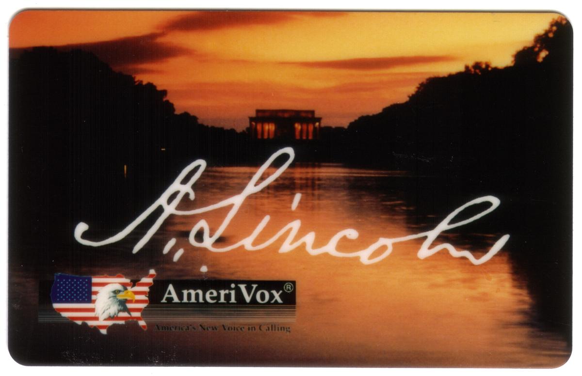 This collectible phone card features a nighttime image of the Lincoln Memorial reflected in the water of the National Mall in Washington, D.C. The sky is painted with warm shades of orange and red, highlighting the illuminated columns of the Memorial. The card prominently displays Abraham Lincoln’s signature in white script across the center.