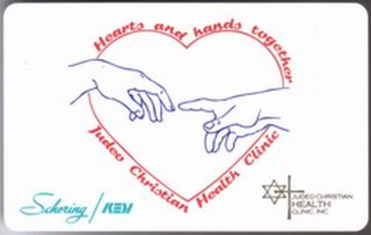 At the bottom of the card, the text reads "Judaica 10m Judeo Christian Health Clinic," indicating the card's medical and religious context connected to a health clinic. Additionally, the card includes branding for Schering and Key Pharmaceuticals, associating the card with these pharmaceutical companies. The text "Interactive Telecard" appears, showing the card is an interactive telephone card designed for use in telecommunication.