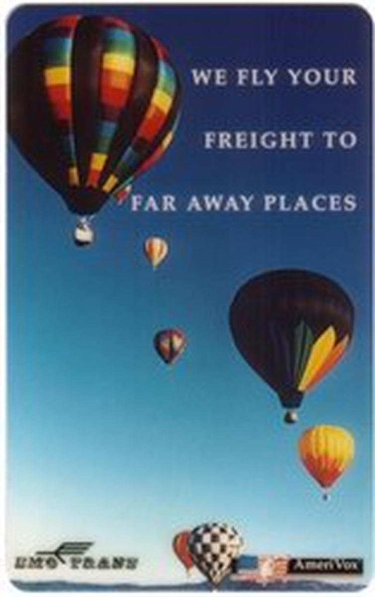 This collectible phone card features the branding of EMO Trans Inc, an international freight company, emphasizing corporate promotionals related to transportation and trucking. The card prominently displays the EMO Transportation logo alongside the tagline, "we fly your freight to far away places," highlighting the company’s air freight services. The design incorporates imagery of hot air balloons, enhancing the theme of aerial transport and ballooning, which connects to the promotional message.