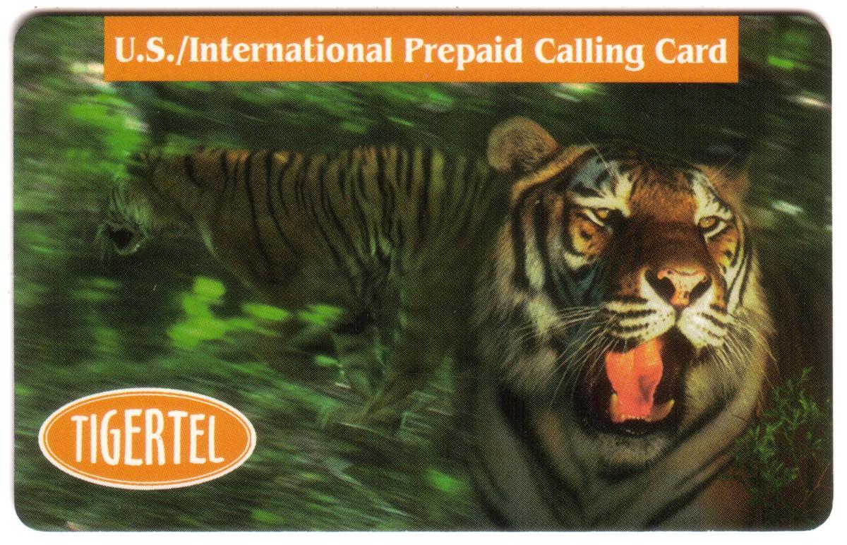 This phone card is an official collectible, featuring only factual and straightforward elements: the company name, animal categories, and the striking photographic image of the two tigers in the forest. It is designed for collectors interested in wildlife or animal-themed phone cards.