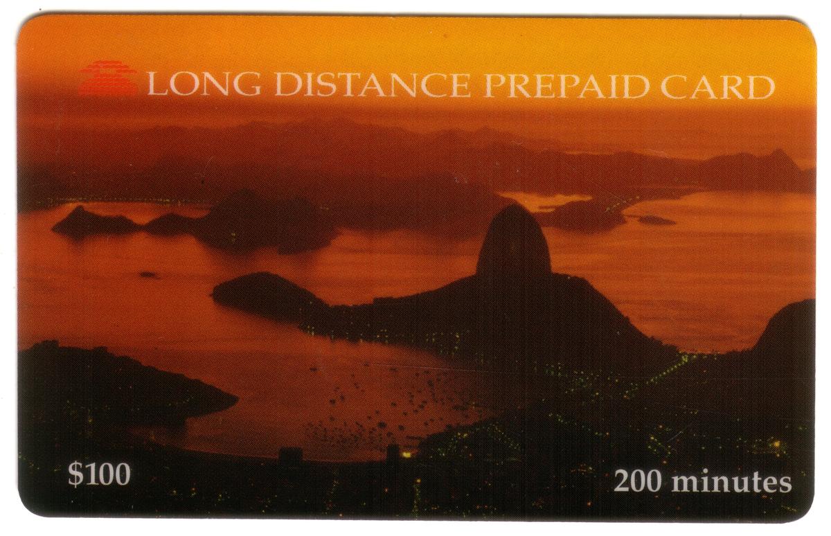 The card is marked with a $100 travel value and indicates a distance allowance of 200 minutes for long-distance calls. Text on the card includes "Rio De Janeiro, Brazil" and "LDDS WorldCom," highlighting its use for telecommunications services associated with these regions and entities. The card also features the country name "Brasil" and references scenic sightseeing, underlining its thematic connection to travel and tourism in Brazil.