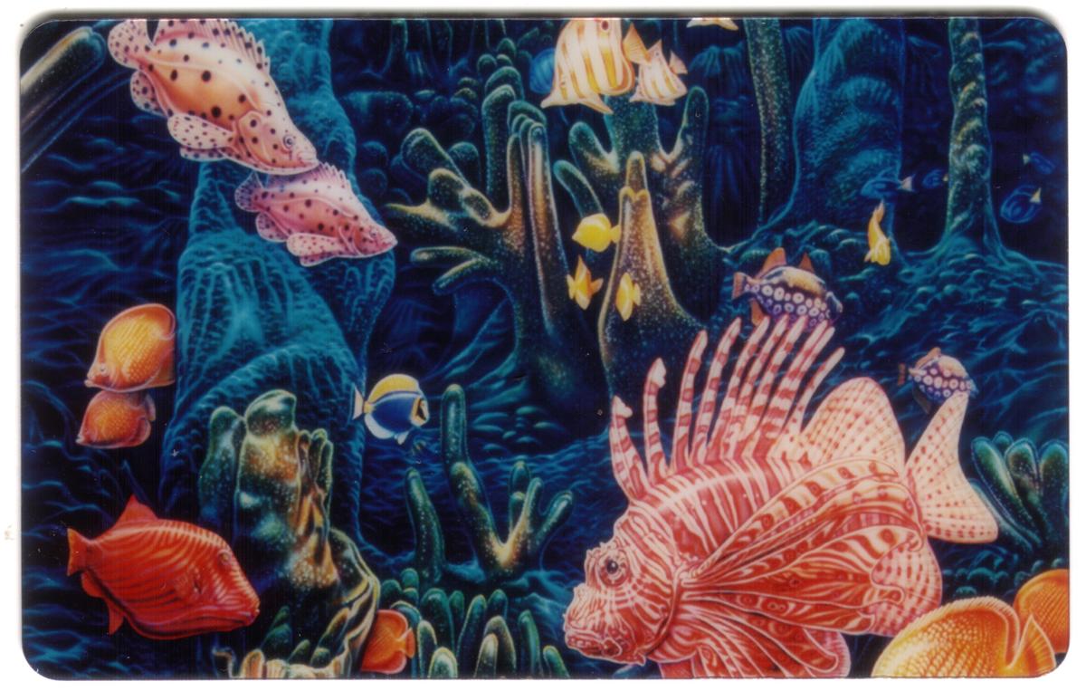 This collectible phone card features an artistic underwater scene centered on tropical fish and coral. The vibrant image showcases a prominently detailed scorpion fish amidst colorful coral formations. The artwork captures the diversity of marine life with a variety of fish species swimming around the reef in bright, natural colors. The composition skillfully blends the rich textures of coral and the distinct patterns on the fish, emphasizing an immersive sealife environment.