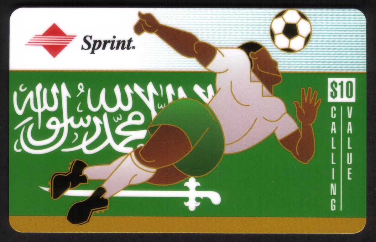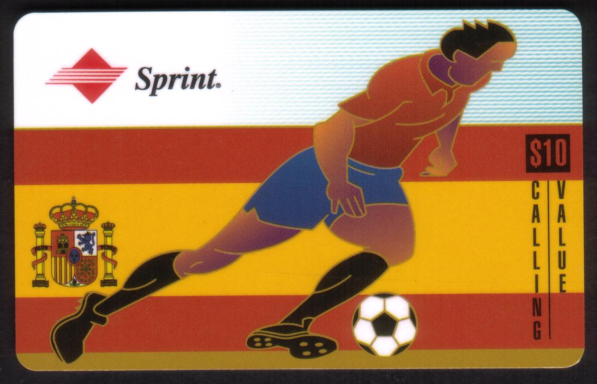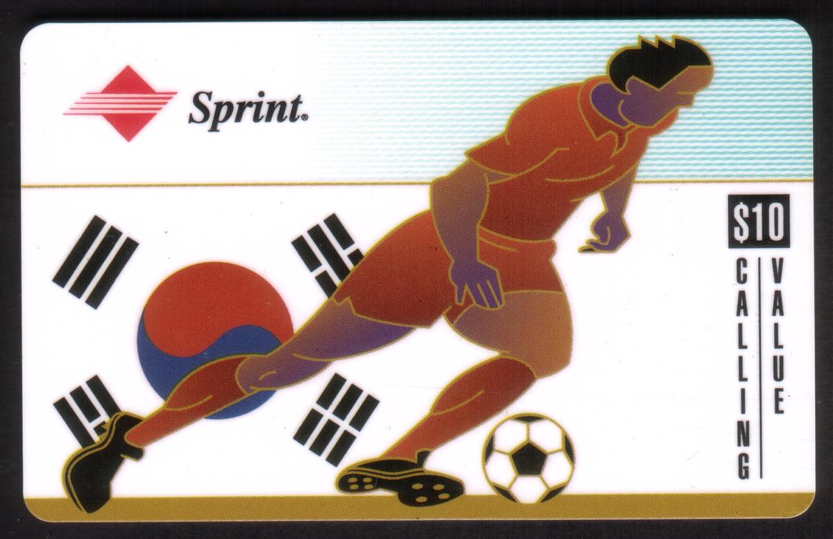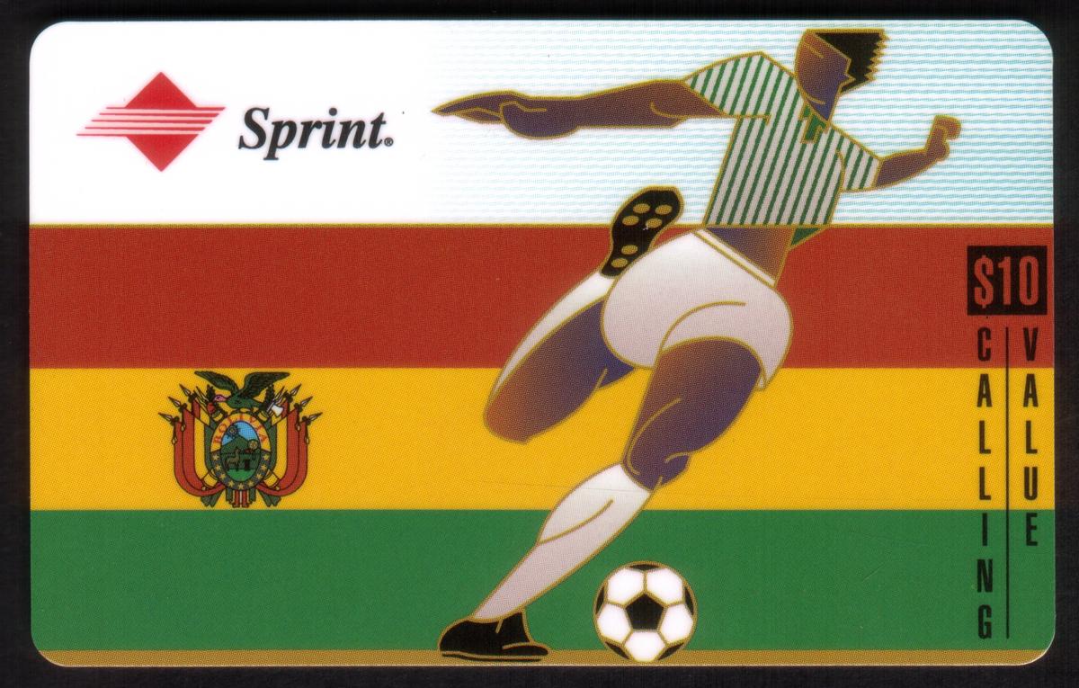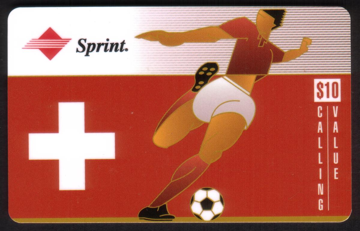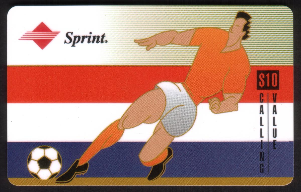 These collectible Sprint phone cards showcase a vibrant World Cup 1994 soccer theme, featuring stylized soccer players in dynamic poses set against the national flags of various countries. Each card has a $10 calling value prominently displayed alongside the words "CALLING VALUE" arranged vertically on the right side. The Sprint logo appears on the upper left corner of every card.