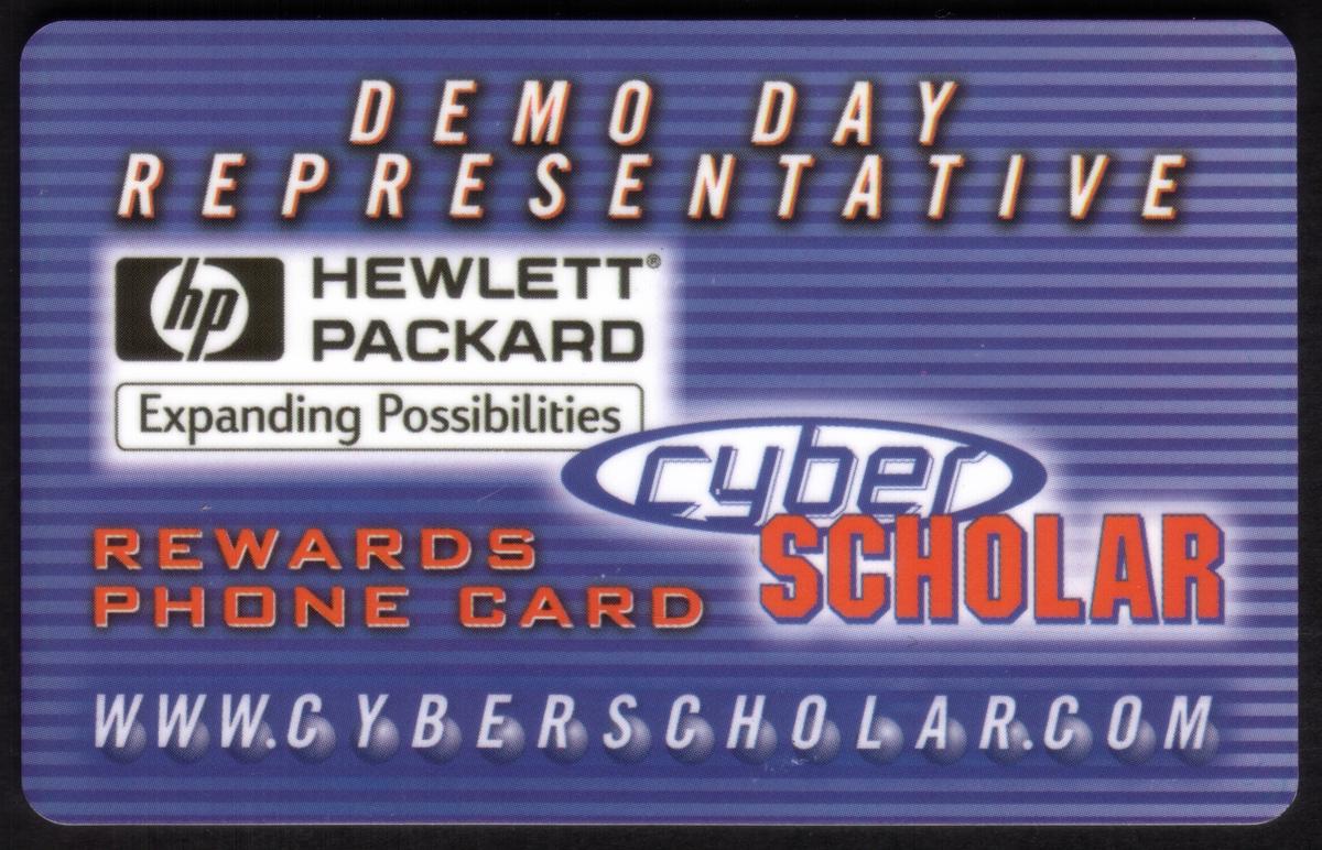 Presented on the card are logos for Hewlett Packard and Cyber Scholar, named as representatives for the Demo Day. These brands reinforce the card's corporate and technological focus. The card also prominently includes the name "Gazelle Telecard" and the SPECIMEN designation, indicating that this is a sample or demonstration card rather than one intended for active use.