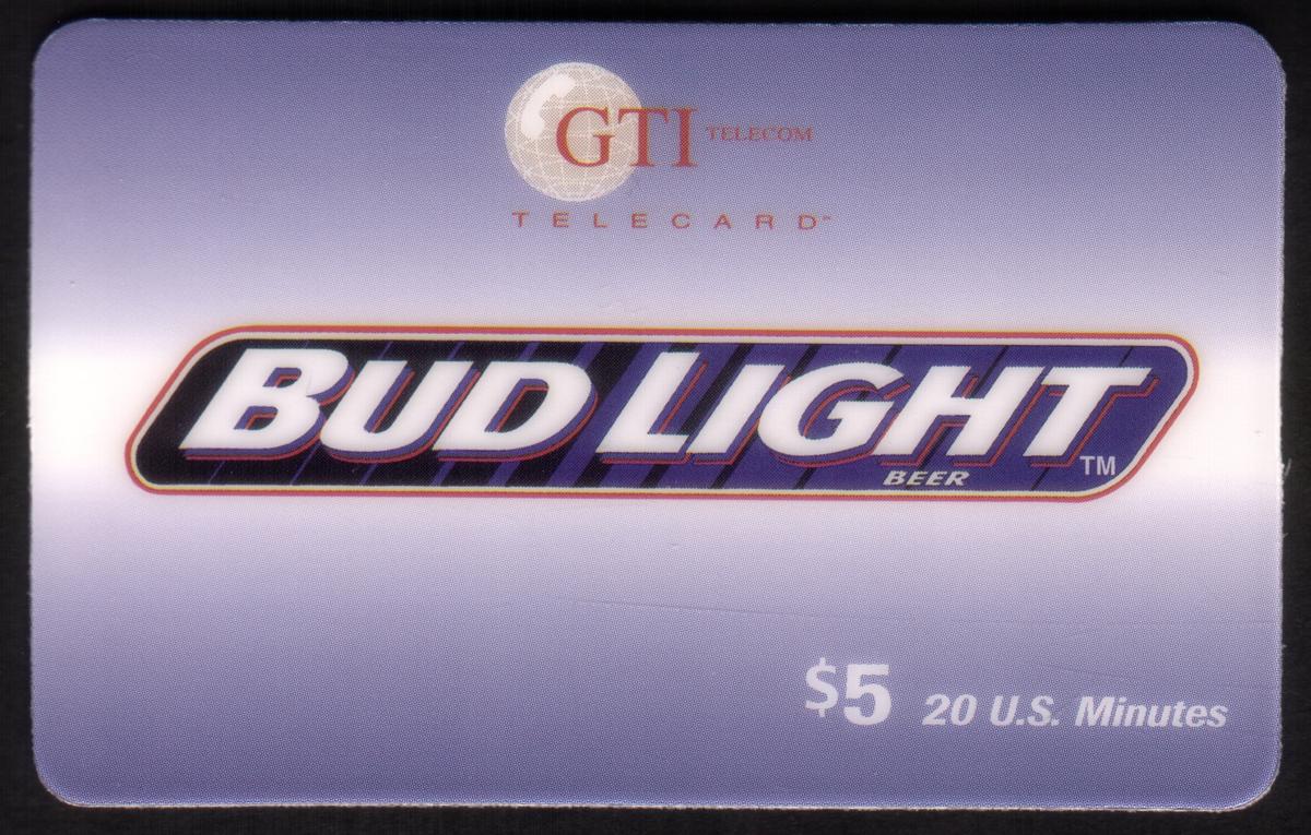 The card includes the name GTI Telecom, Inc. as the issuer or associated company, which is placed near the bottom part of the design. The overall style is clean and promotional, emphasizing the Bud Light brand and its association with beverages and alcohol. The design is straightforward, focusing on brand recognition with simple but distinct graphical elements.