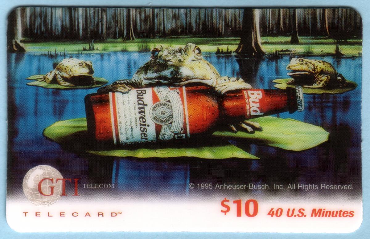 This collectible phone card features a vivid promotional design for Budweiser beers and beverages. The central artwork depicts two green frogs sitting on green lily pads in a swamp setting. One of the frogs is holding a Budweiser beer bottle, which displays the iconic red and white Budweiser label prominently. Surrounding the frogs are aquatic plants and water typical of a swamp environment, creating a natural habitat scene with a calm and lively atmosphere.