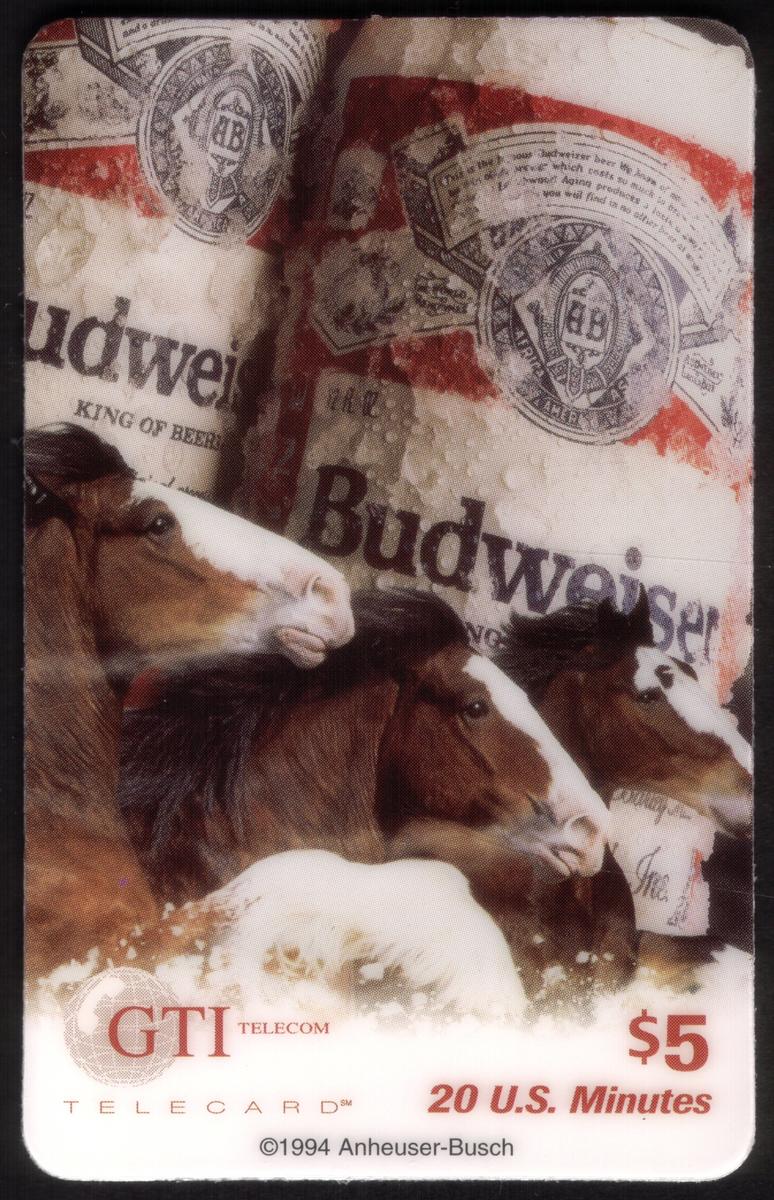 This card is issued by GTI Telecom, Inc., as indicated by text on the lower right side. The overall tone of the image emphasizes the connection between Anheuser-Busch’s Budweiser brand and the legendary Clydesdale horses, making it a promotional item for Budweiser beers.