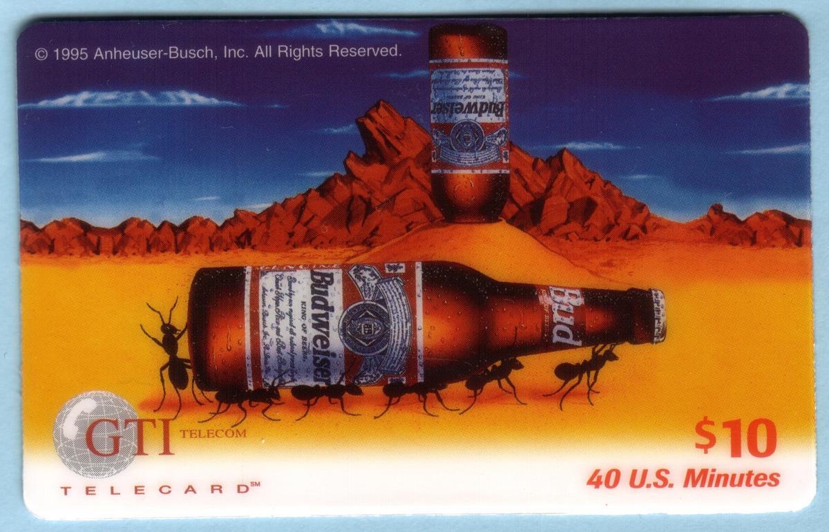 The card includes the name "GTI Telecom, Inc." printed near the bottom, indicating the issuing company. The brand Anheuser-Busch is referenced through the Budweiser bottle, connecting the card to the well-known American beer producer. The card’s value is $10, clearly printed on the surface. Above the ants and bottle, the word "Promotional" is visible, highlighting the card’s marketing nature tied to Budweiser beers and alcoholic beverages.