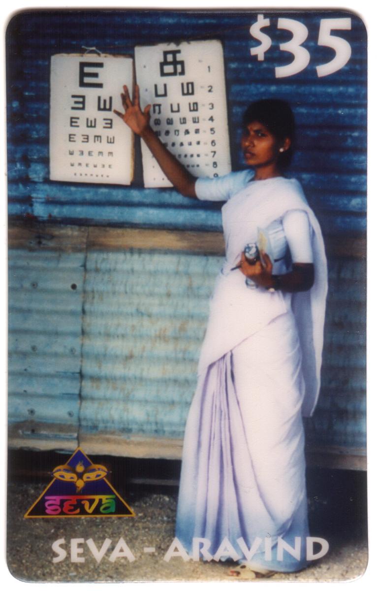 This collectible phone card features an image related to the Seva Foundation and Aravind, organizations focused on preventing blindness. The card prominently displays a woman holding charts, emphasizing education and awareness aimed at preventing blindness. The design is linked to themes of healthcare and social activism, highlighting efforts by doctors, professors, and social activists working to relieve suffering and build communities.