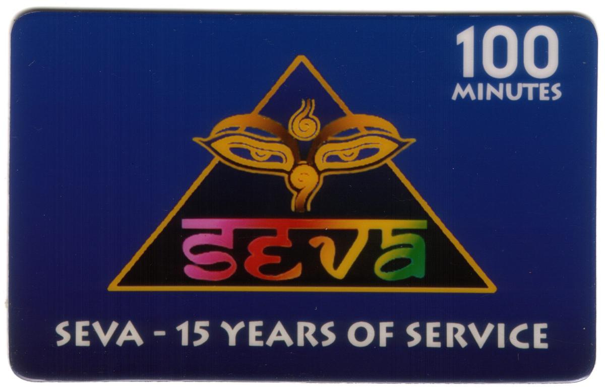 This collectible phone card commemorates the Seva Foundation’s 15 years of service. The card features a deep blue background with the word "seva" written in colorful Devanagari-style script inside a yellow-outlined triangle. Above the text, inside the triangle, is a stylized gold emblem resembling eyes with intricate detailing. Below the triangle, the text reads: "SEVA - 15 YEARS OF SERVICE" in bold white letters. In the top right corner, the card displays "100 MINUTES" in white, indicating its usage value.