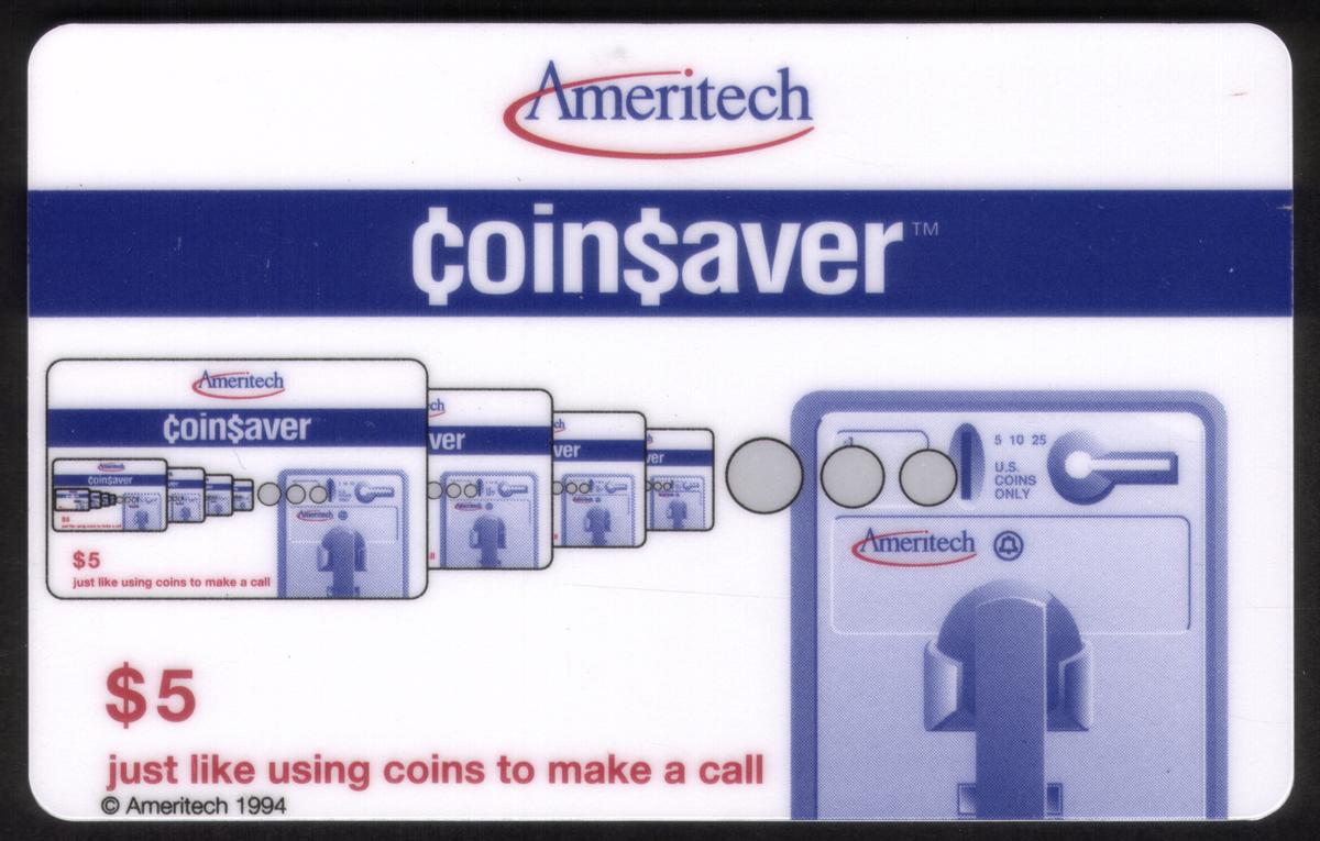 This sealed Original Coin$aver phone card is part of a promotional or advertising series connected to Ameritech. It visually represents the era of payphones and phone cards before mobile phones became widespread. The imagery combines both the hardware (payphones) and the consumable medium (phone cards), offering a collectible item of particular interest to enthusiasts of telecommunication history and corporate promotion.