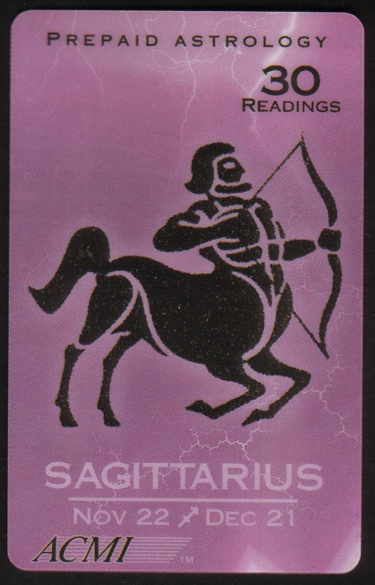 The card’s design includes the name “ACMI” and the word “SPECIMEN,” suggesting it is a special or sample edition. Overall, the visual and textual elements firmly position this collectible card within an astrology-themed series focusing on Sagittarius and its spiritual and celestial symbolism.