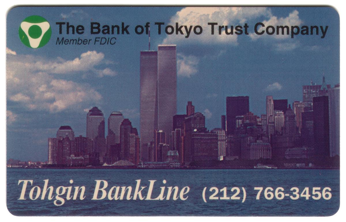 Bank of Tokyo Trust Company phone card featuring NYC skyline and Twin Towers, emphasizing global finance, trust, and international banking connections. |