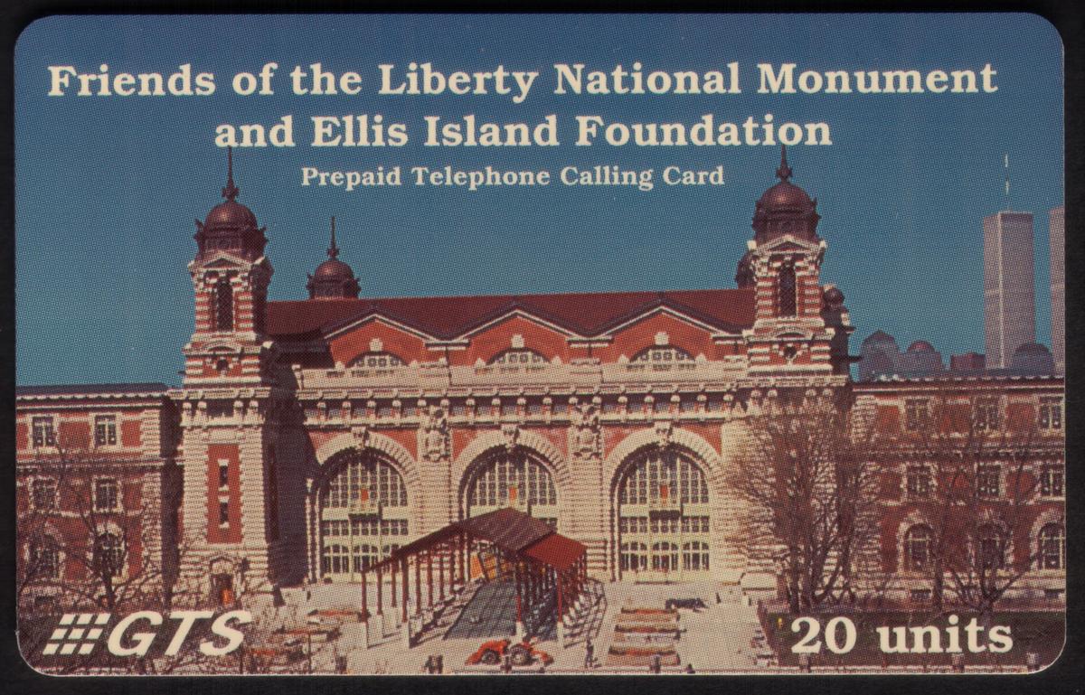 The front of the card includes text reading "Friends of The Liberty National Monument - Ellis Island - Global Tel. Solutions," linking the themes of national pride, historical preservation, and telecommunications. The card is clearly connected to American icons and National Monuments, serving as a collectible representation of American heritage centered on New York City.