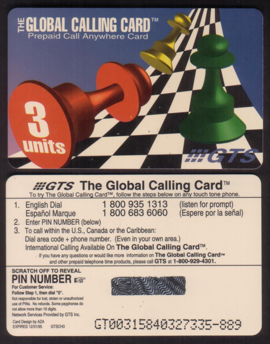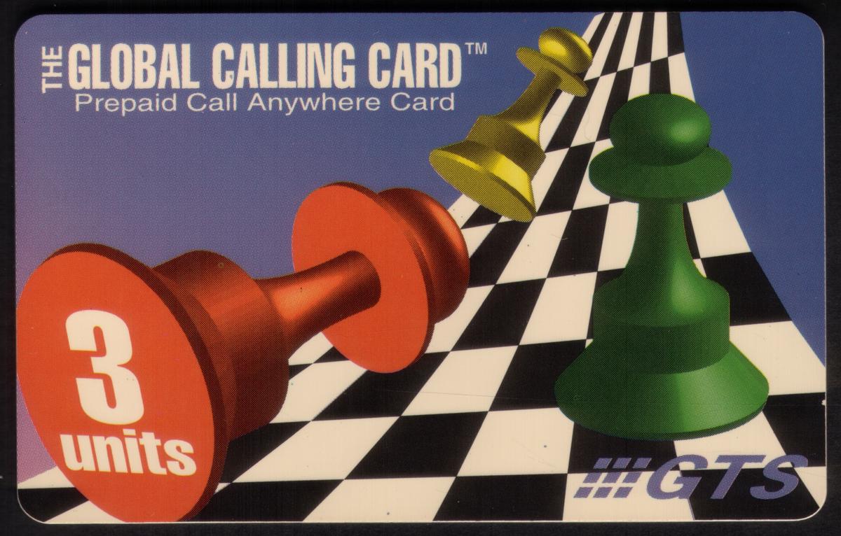 In the upper left corner, the card displays the text “THE GLOBAL CALLING CARD™ Prepaid Call Anywhere Card” in white capital letters. The red pawn in the foreground has “3 units” written on its flat base in white. The GTS logo appears in the lower right corner in purple, consisting of stylized letters and a series of horizontal lines.