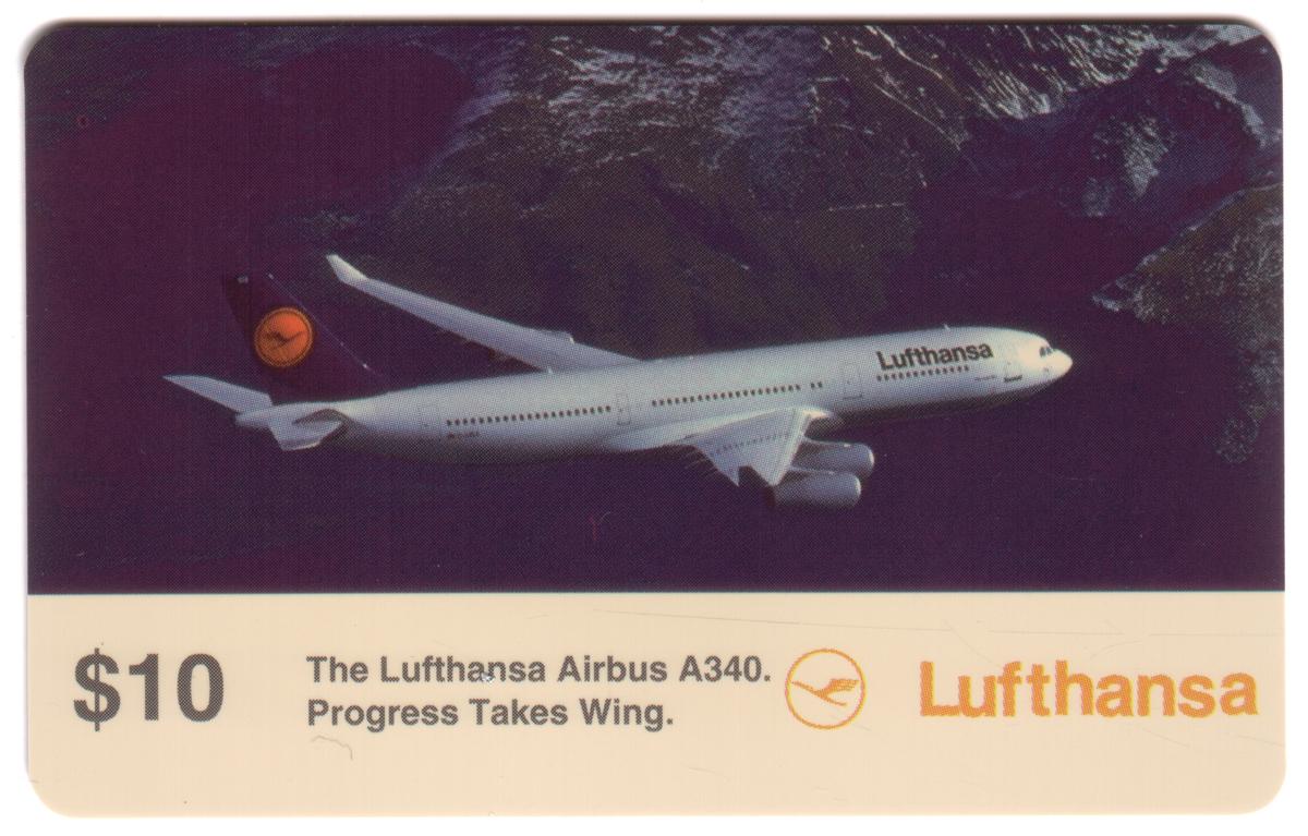 Overall, the card presents a professional and clean design focused on aviation and transportation. It serves as a collectible piece representing commercial air travel and Lufthansa Airlines’ Airbus A340 aircraft.