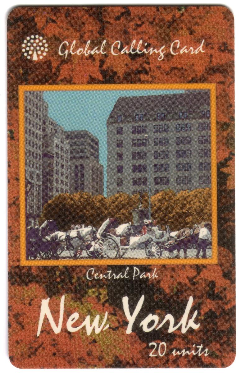 The card includes the text “Global Tel. Solutions” and “20u,” indicating it has a value of 20 units. It is associated with sightseeing, travel, and animals, reflecting the classic attraction of horse-drawn carriage rides in Central Park. The card represents a collectible item linked specifically to New York City and its notable landmarks.