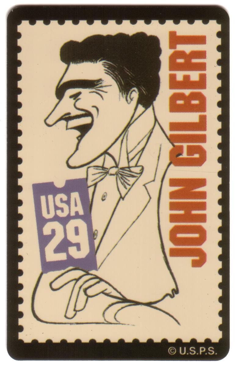 Vintage-style John Gilbert caricature phone card with stamp motif, bold red lettering, and Hirschfeld-inspired art celebrating silent film Hollywood. |