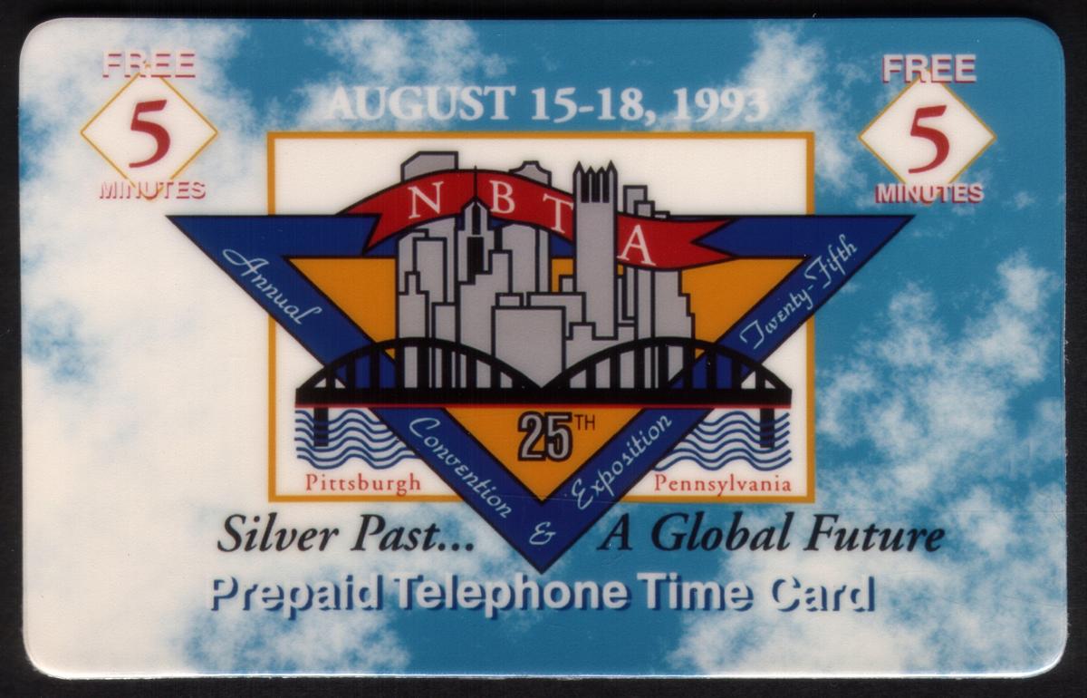 This collectible phone card commemorates the National Business Travel Association (NBTA) 25th Annual Convention held in 1993 in Pittsburgh, Pennsylvania. The card prominently features the NBTA logo alongside the event details, including “25th Annual Convention” and “1993 Pittsburgh PA.” It is issued by Global Tel. Solutions and offers a complimentary 5 free minutes of calling time, as indicated on the card.