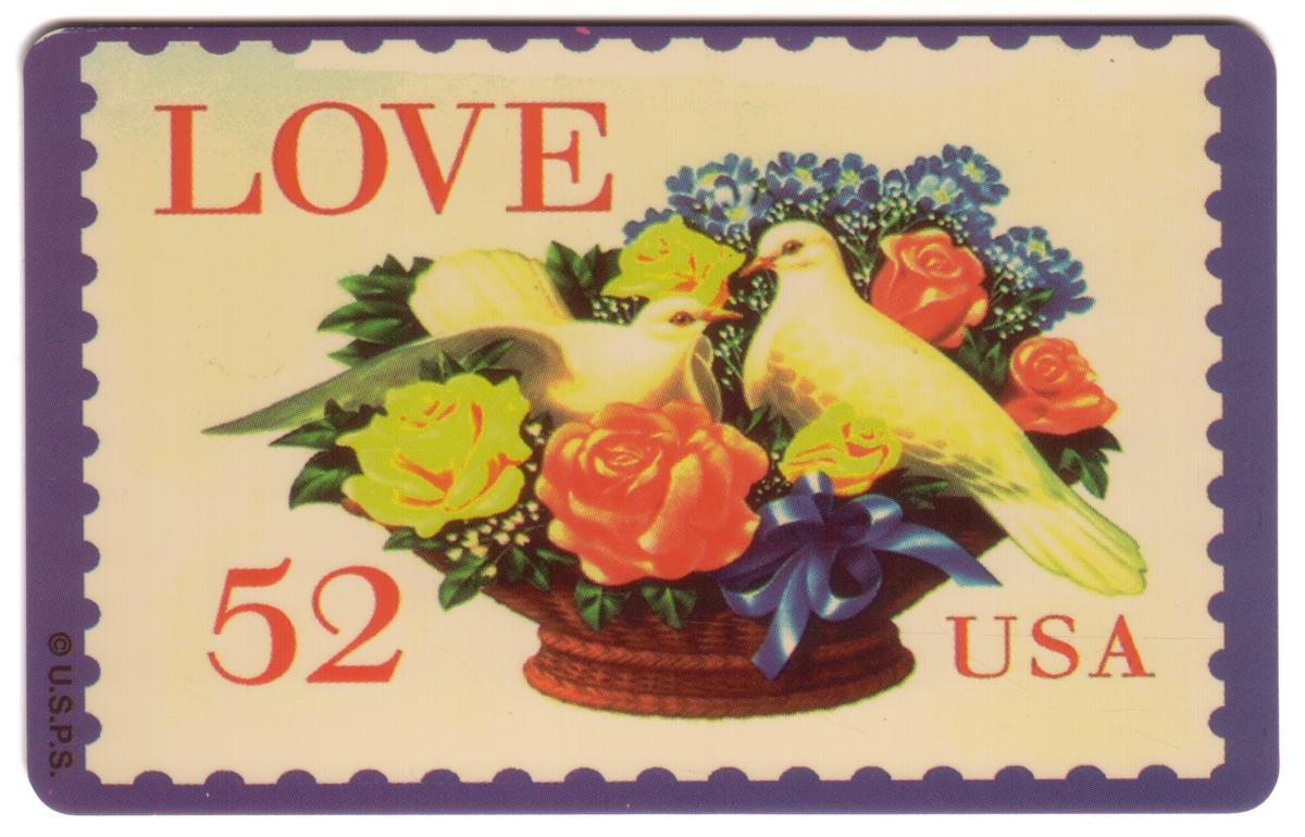 This collectible card features the design of a 1994 .52 Cent Love Postage Stamp titled "Doves In A Basket." The central image shows two white doves nestled inside a woven basket adorned with floral elements. The doves appear calm and peaceful, symbolizing love and harmony. Surrounding the basket, small pink and white flowers with green foliage add a delicate decorative frame to the composition.