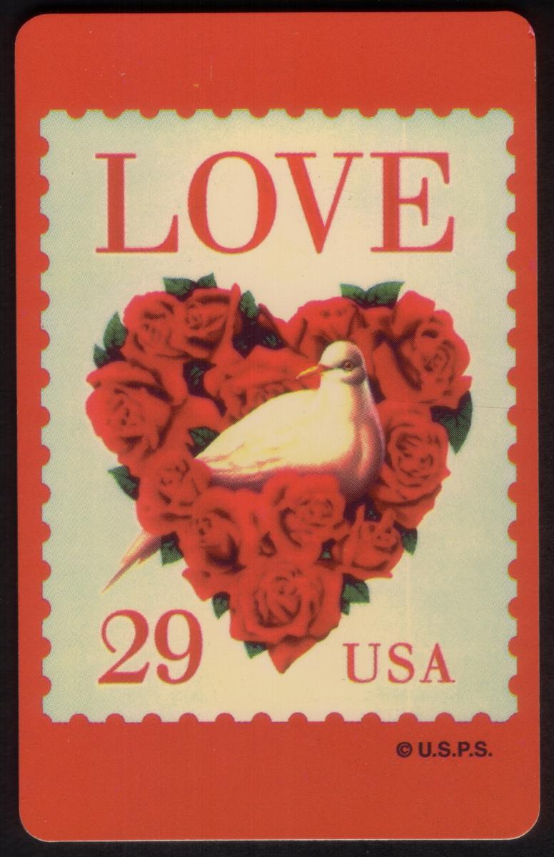 The card includes stamp imagery, incorporating the concept of philately and stamp collecting. The words "Love Stamp" appear prominently, along with the denomination “.29 Cent Dove In Red Roses” indicating the stamp's value. The overall design evokes themes of Valentine’s Day and holidays related to love and celebration. The presence of birds, animals, and flowers connects it to nature and romantic symbolism.