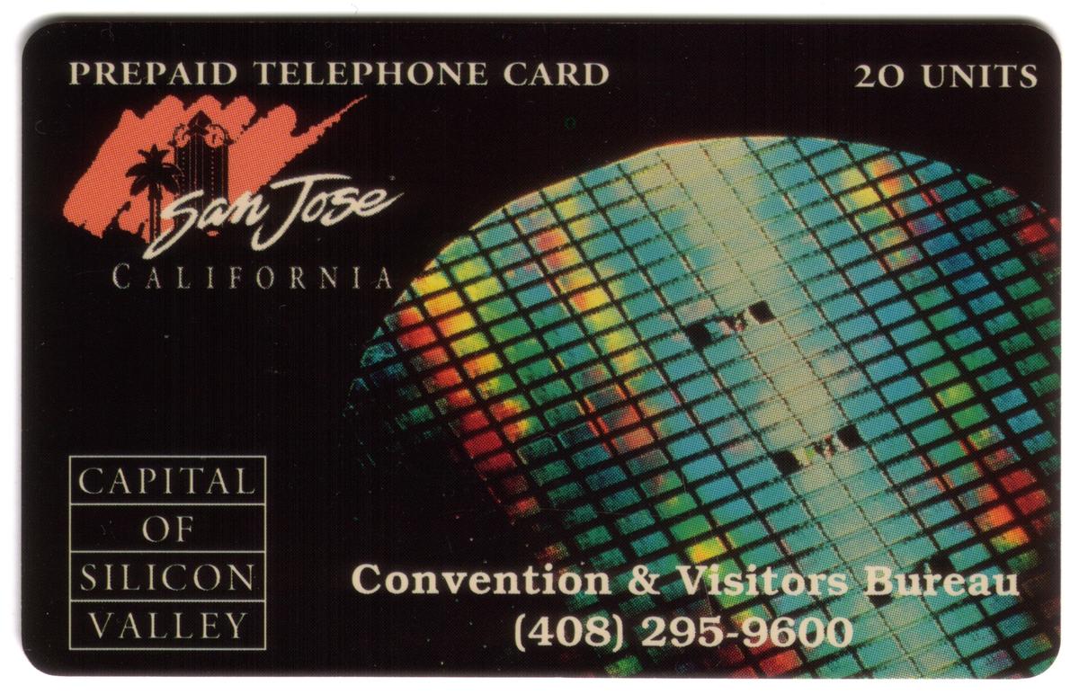 This collectible chip card features an artistic depiction associated with San Jose, California, known as the capital of Silicon Valley. The card prominently displays the text “San Jose California Convention & Visitors Bureau” “Silicon Chip” near the top left area. The card’s design includes a photographic or graphic representation of a semiconductor silicon wafer or chip, emphasizing its importance as a symbol of Silicon Valley’s electronics industry. The background has technological and circuitry motifs which enhance the theme centered around advanced electronics and innovation.