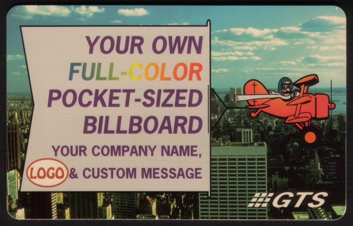 This collectible chip card features a promotional design for Global Tel. Solutions (GTS). The card prominently displays a cartoon airplane with eyes and a smiling mouth, piloted by a cartoon pilot wearing a blue uniform and cap. The pilot is illustrated with a friendly expression, seated in the cockpit of the airplane. The airplane carries a large billboard sign on its side that reads "2u GTS Flying Billboard," emphasizing the promotional nature of the card.