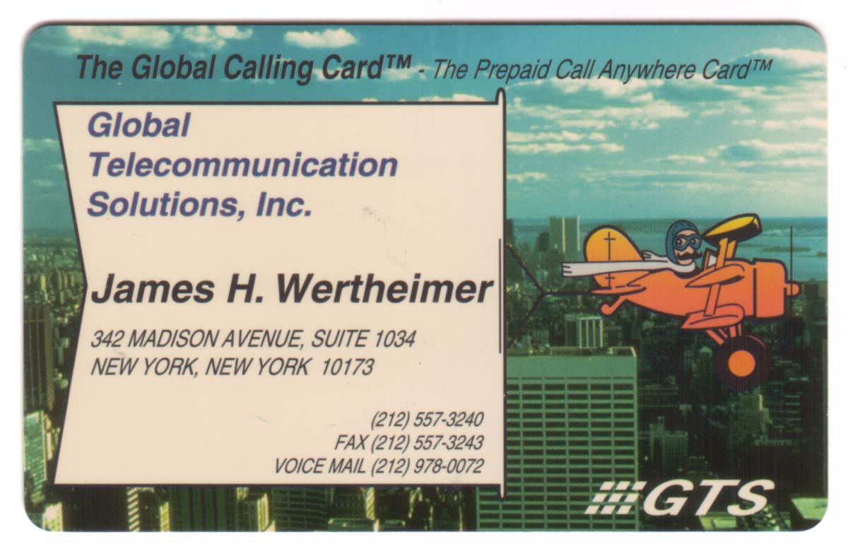 The card includes corporate branding elements. The top left corner shows the logo and name "Global Tel. Solutions" in bold, uppercase type. Near the top right, the name "James H. Wertheimer" appears in blue text. Across the bottom, the text "2u GTS Flying Billboard Business Card" is displayed in a white font with a blue background accent. The overall composition creates the impression of a promotional give-away item designed to market a business with an aviation theme.