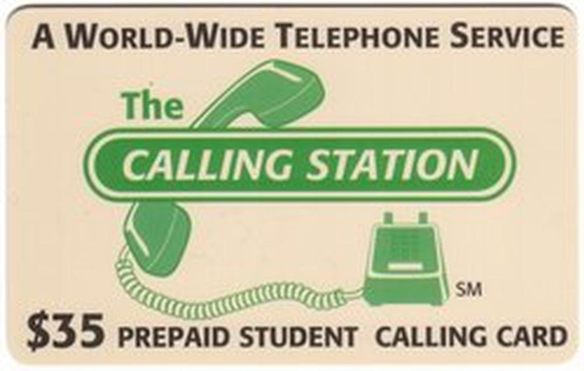 The collectible prepaid phone card titled "The Calling Station" features a design focused on telephones and phonecards, highlighting world-wide telephone service. The front of the card prominently features the text "The Calling Station" along with the label "Prepaid Student Calling Card SPECIMEN," indicating it is a sample card and not for active use. The card lists a value of $35 and carries the branding of Global Tel. Solutions.