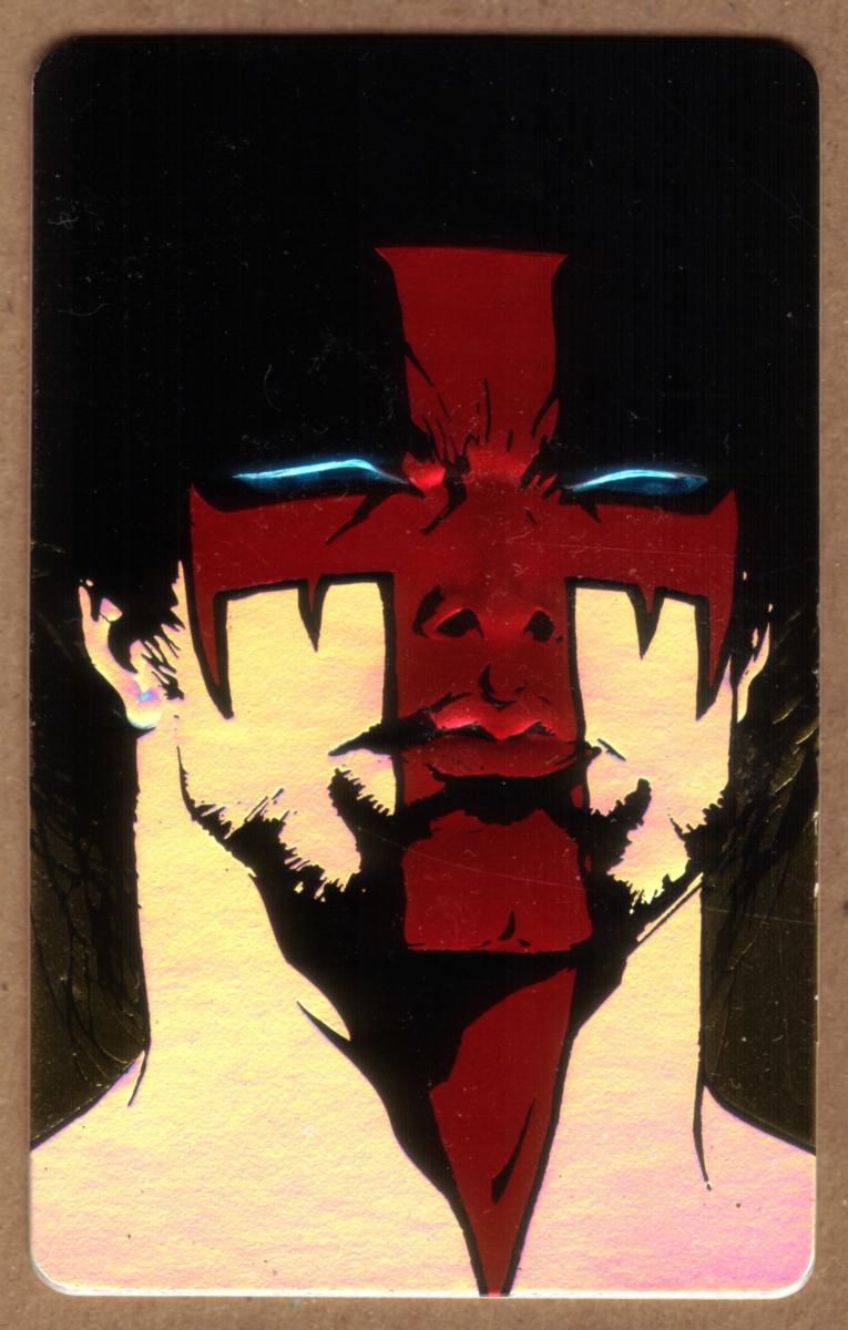 This collectible phone card features a striking artistic rendition of a male face with a glowing red cross prominently superimposed over it. The face is shadowed with dark tones, emphasizing the sharp contrast against the bright red cross that extends vertically down the center, covering the nose and mouth area. The eyes of the figure emit a distinct bright blue glow, adding a supernatural or dramatic effect to the image. The overall artwork presents a bold and intense visual style, characteristic of comic or graphic novel illustrations.