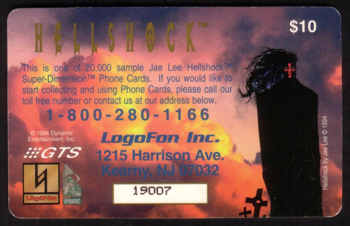 This $10 collectible phone card embodies the fusion of comic art and promotional merchandise, representing Hellshock by Jae Lee with foil effects that enhance the image’s visual impact. The vibrant cross and glowing eye elements set against a predominantly dark background create a memorable and distinctive piece for collectors and fans of comic art and phone card memorabilia.