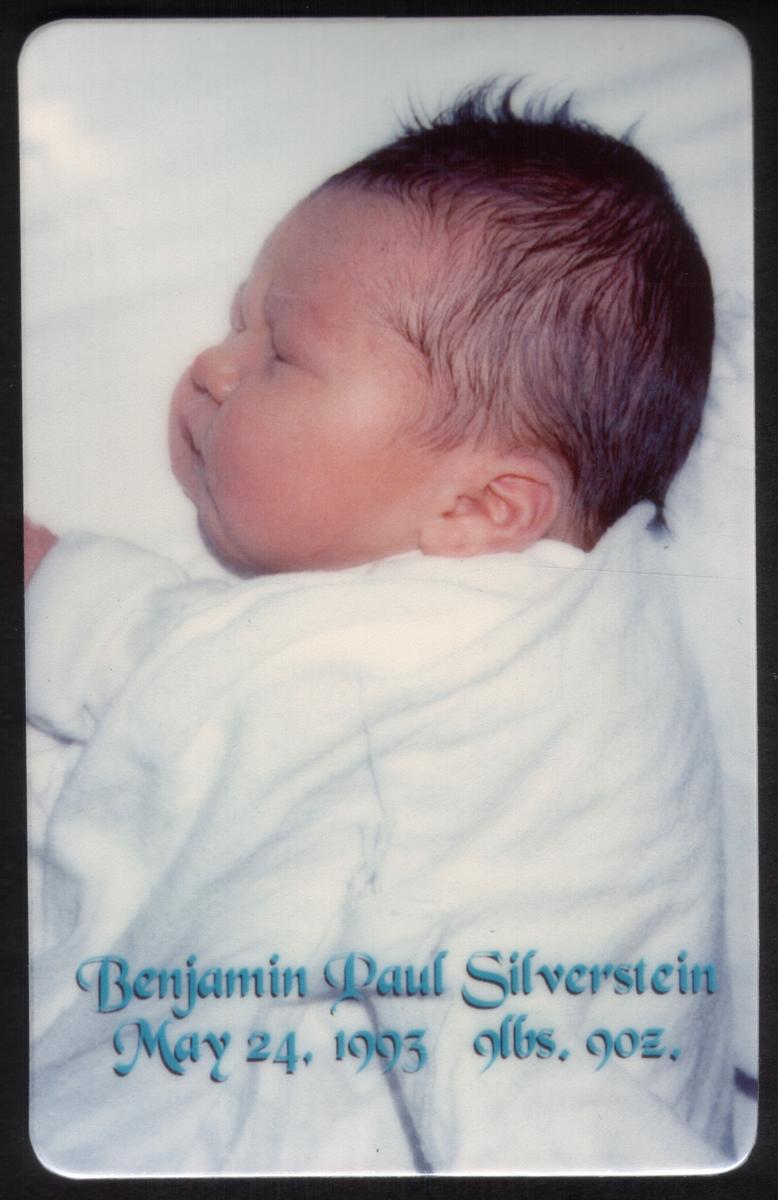 Overall, the card combines a personal portrait with telecommunications branding, serving as a collectible phone card that commemorates Benjamin Paul Silverstein as an infant. The presentation is minimalistic, focused entirely on the baby wrapped in the blanket alongside the related text and logos.