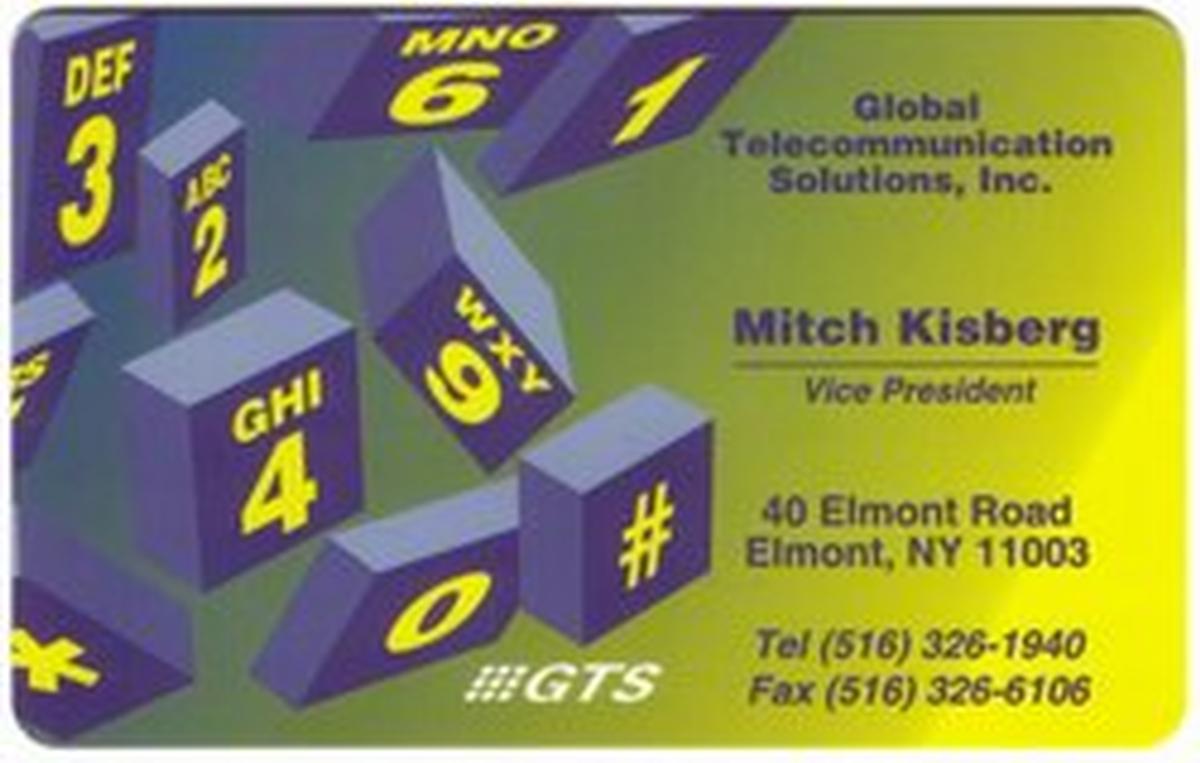 This card features a promotional design associated with Global Tel. Solutions, highlighting corporate branding prominently. The card displays the name Mitch Kisberg, who holds the title of Vice President at Global Tel. Solutions. The company's telephone number is also included, indicating its use as a business or corporate contact card. The layout includes a telephone keypad image commonly seen on telephone-related cards, reinforcing the corporate communication theme.