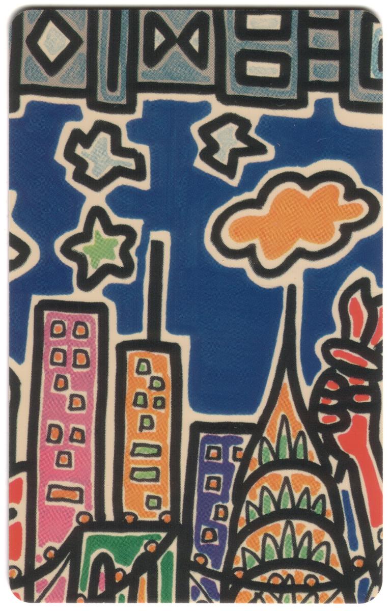 This collectible phone card features artistic representations of iconic New York City landmarks, including the Empire State Building and the Statue of Liberty. The artwork presents these American landmarks with vibrant colors and a cartoon style, capturing the essence of New York City’s skyline. A helicopter is depicted hovering near the Empire State Building, adding dynamic movement to the scene. Surrounding elements include bridges, boats, and fish, enhancing the cityscape with details of its waterfront and maritime activity.