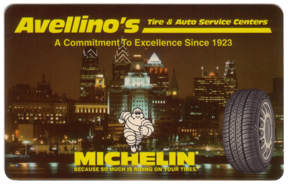 The lower portion of the card includes the name "25u Avellino's Tire & Auto Service Centers," linking the card to this business entity. Additional text shows "Michelin Tires SPECIMEN" along with "Global Tel. Solutions," signifying a connection to telecommunications and collectible purposes. The card design combines automotive and urban themes, marking its focus on tire service and quality in a modern city setting.