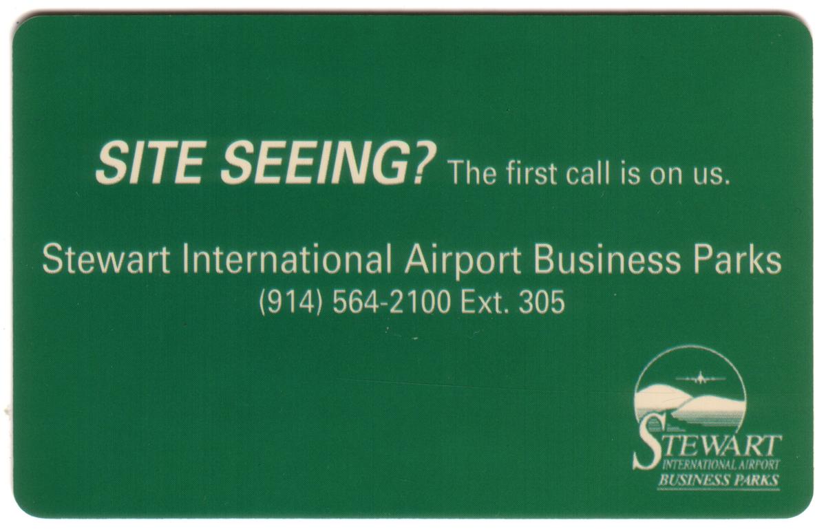 This card serves as a promotional piece linking the Stewart International Airport business environment with key telecommunications entities. The visual presentation underscores the integration between air travel infrastructure and global communication services through the featured logos and branding.