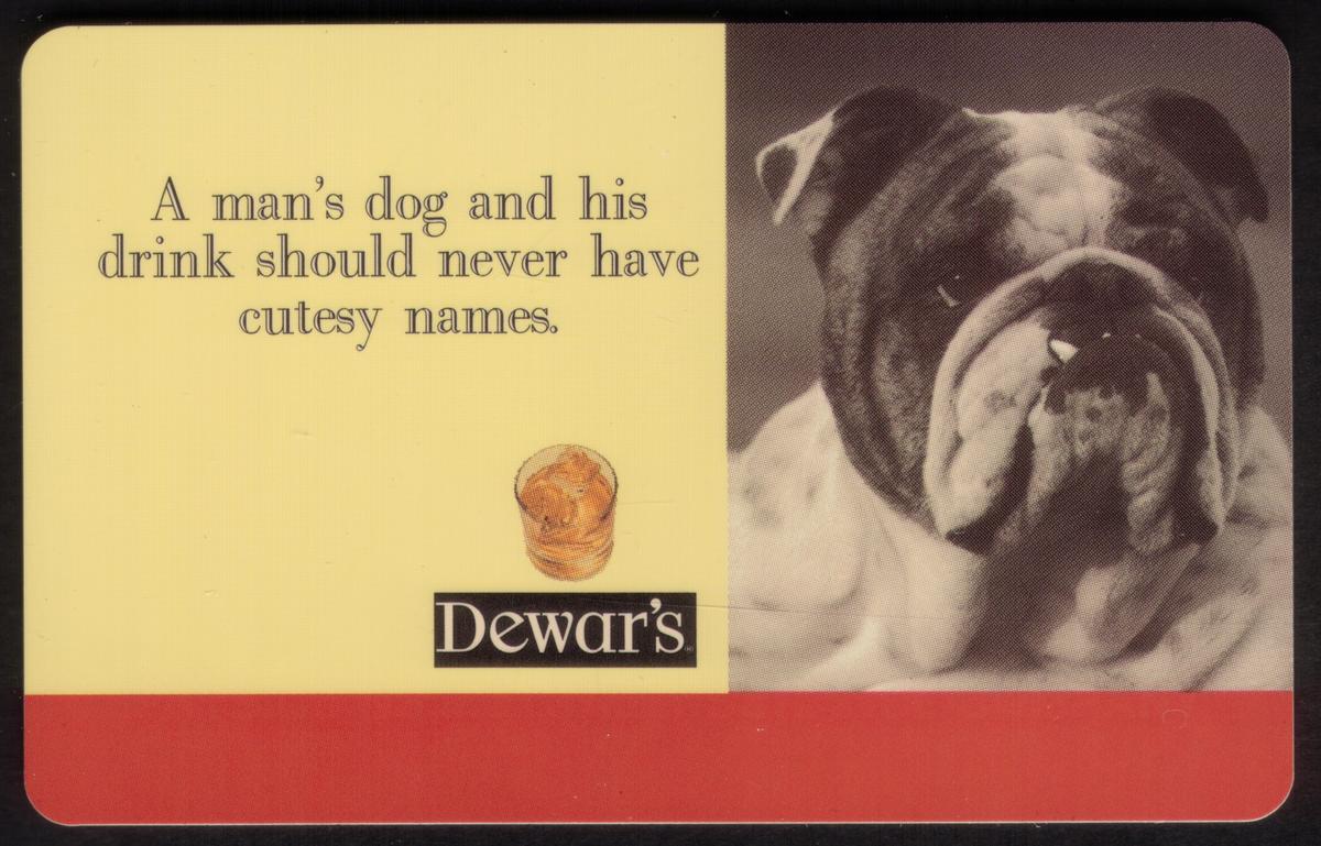 This phone card is a specimen edition, created for promotional purposes, combining an animal motif—the man's dog—with a recognized alcoholic beverage brand. The presentation is straightforward and professional, associating the dependable bulldog image with Dewar’s Scotch Whisky in a collectible telecommunication format.