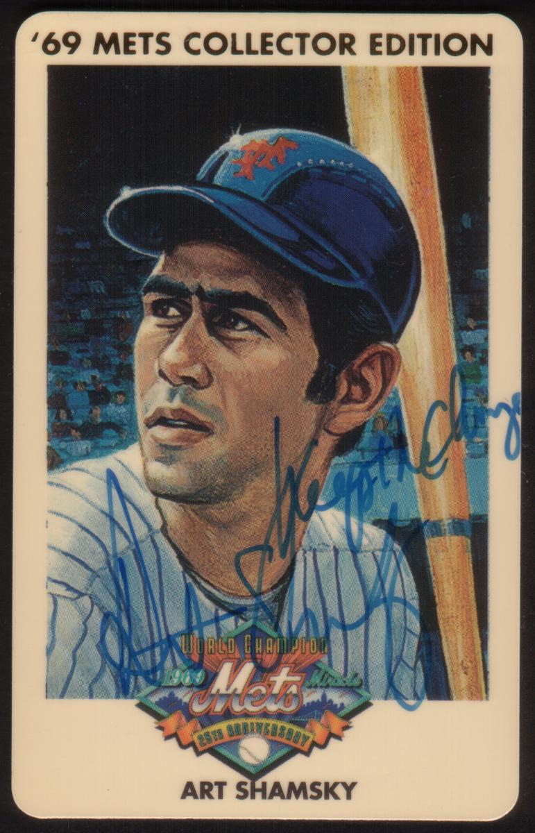 This collectible phone card features an image celebrating the 25th anniversary of the 1969 New York Mets, known as the "Miracle Mets." The card prominently highlights Art Shamsky, a key player from that championship team, whose autograph is featured on the front. The design incorporates bold text indicating "1969 CHAMPION" and "25th ANNIV," marking a quarter-century commemoration of the Mets' historic World Series victory.