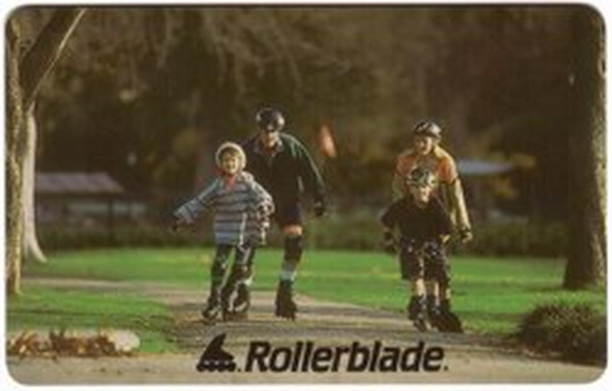 The overall design includes clear, bright colors and detailed photographic quality, presenting the family in motion on a smooth surface suitable for rollerblading. The adult figures lead and support the children, giving the impression of shared enjoyment and active lifestyle. This card is a collectible item related to rollerblade sports and family outdoor activities, branded under Global Tel. Solutions.