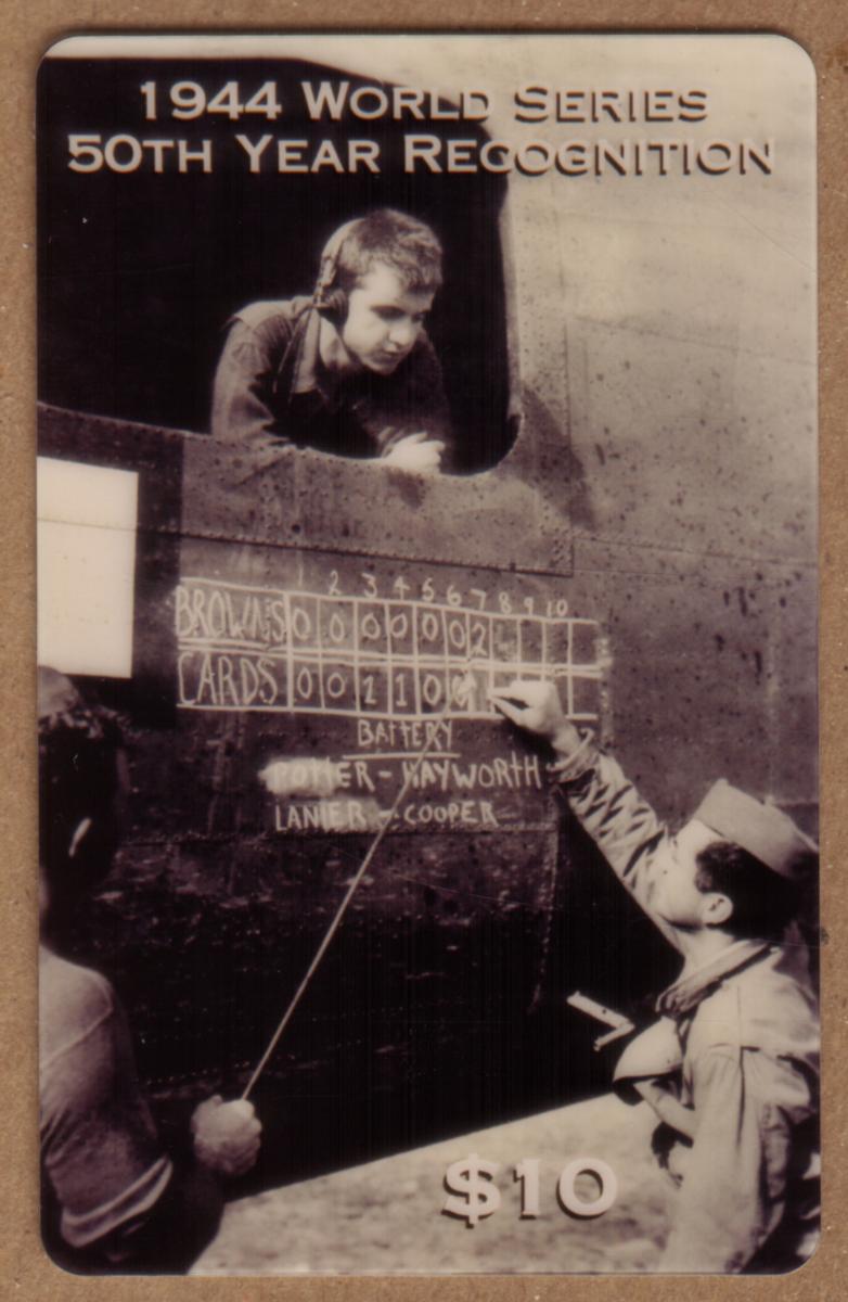 This collectible phone card commemorates the 50th Year Recognition of the 1944 World Series. The front image is a black and white photograph showing two men interacting near a scoreboard painted on the side of a military aircraft. One man, dressed in military attire and wearing a cap, points towards the scoreboard with a stick, while the second man leans out of the aircraft window observing. The scoreboard displays runs and hits for two teams labeled "Browns" and "Cards," referencing the St. Louis Browns and St. Louis Cardinals, participants in the 1944 World Series.