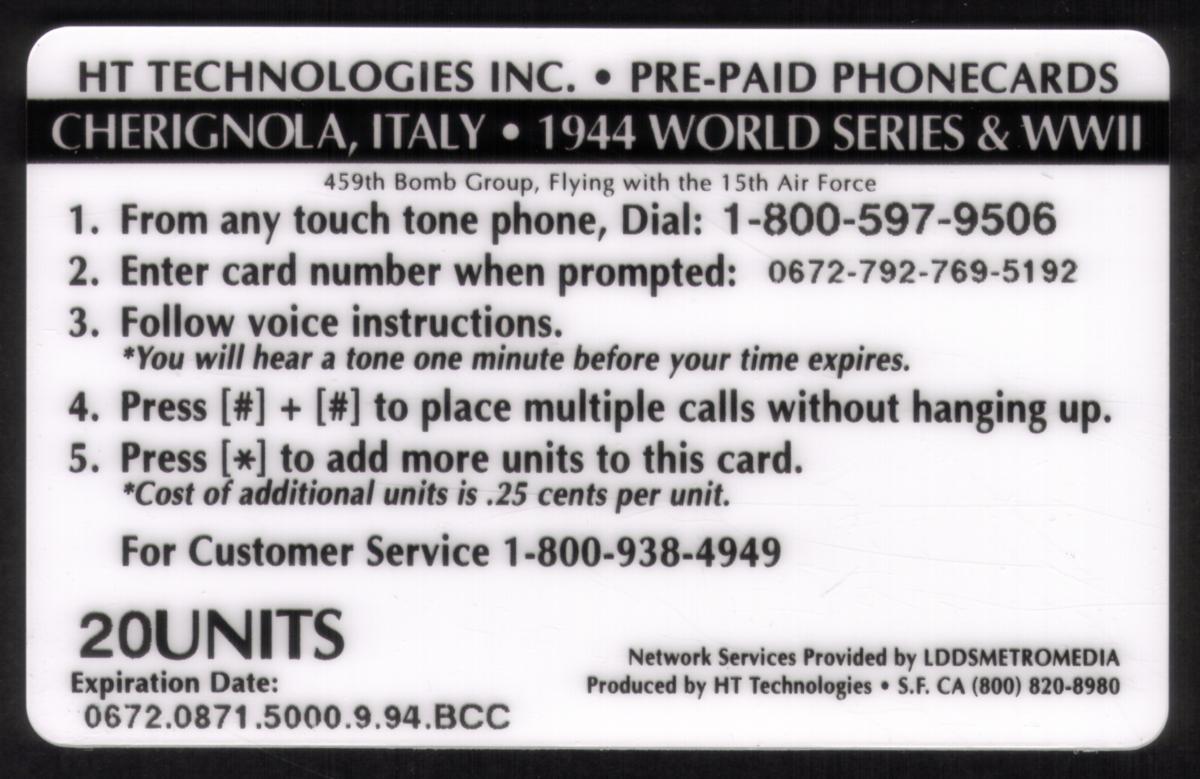 This phone card is associated with HT Technologies and references Cherignola, Italy, connecting it to the 459th Bomb Group of the 15th Air Force during World War II. It celebrates the intersection of baseball history and WWII military service. The card is issued by WorldCom.