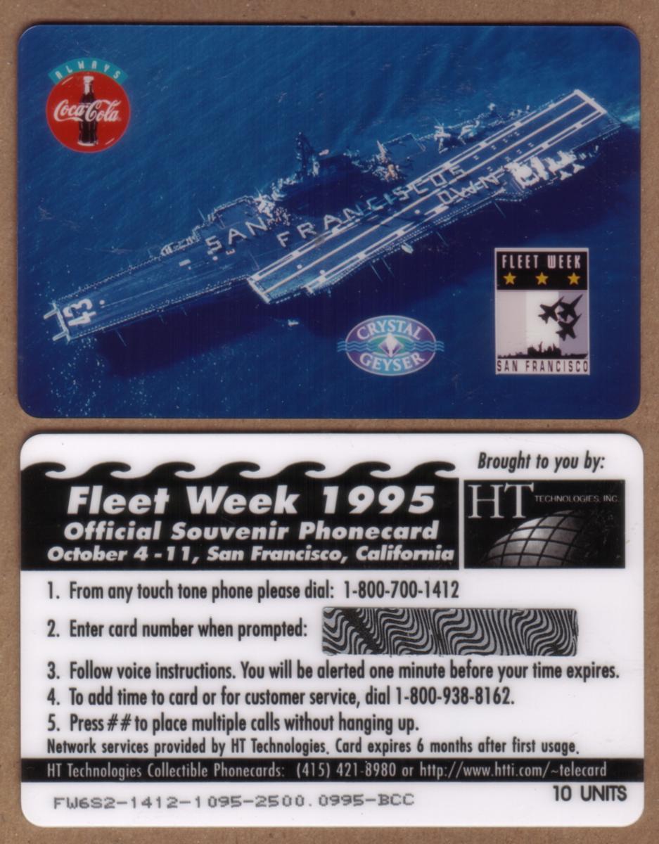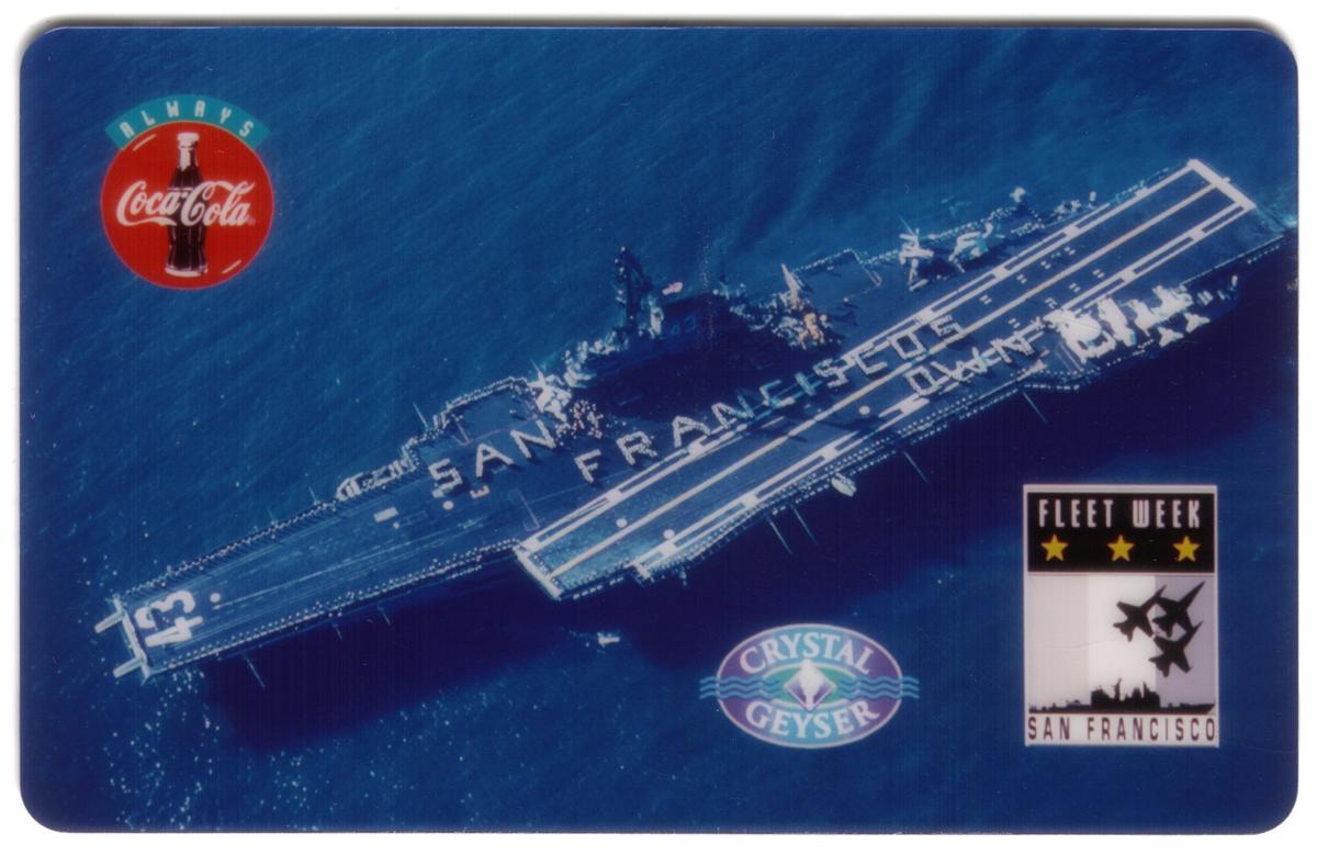 This phone card commemorates the military’s Navy Armed Forces participation in San Francisco’s Fleet Week, an annual event celebrated in the city. The presence of Coca-Cola and Crystal Geyser logos highlights these sponsors in conjunction with the naval theme. The card combines military pride with corporate partnerships, illustrating a significant cultural event centered on the aircraft carrier and fleet demonstration.