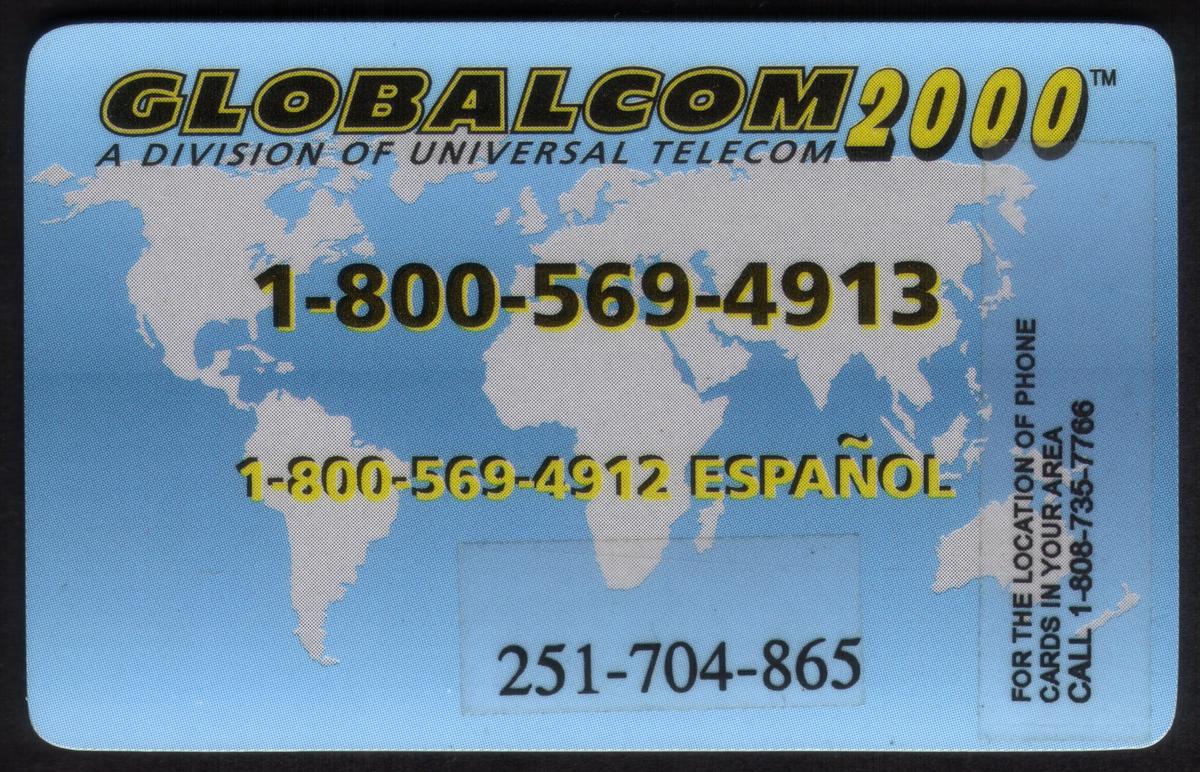 The card displays the "Globalcom 2000" logo prominently near the bottom right area, with an accompanying "WorldCom" logo positioned just above it. Both logos are integrated into the map design, reinforcing the international communication theme. The overall visual combines cartographic elements with corporate branding to underscore global connectivity.