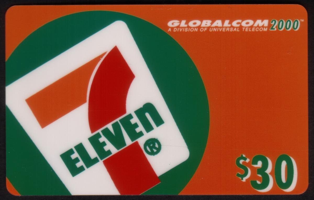 The card includes the name Globalcom 2000 printed on it, identifying the issuer or network associated with the card. The denomination of $30 is clearly shown, indicating the card’s value. The color scheme and fonts are clean and modern, reflecting corporate branding consistent with 7-Eleven marketing materials.