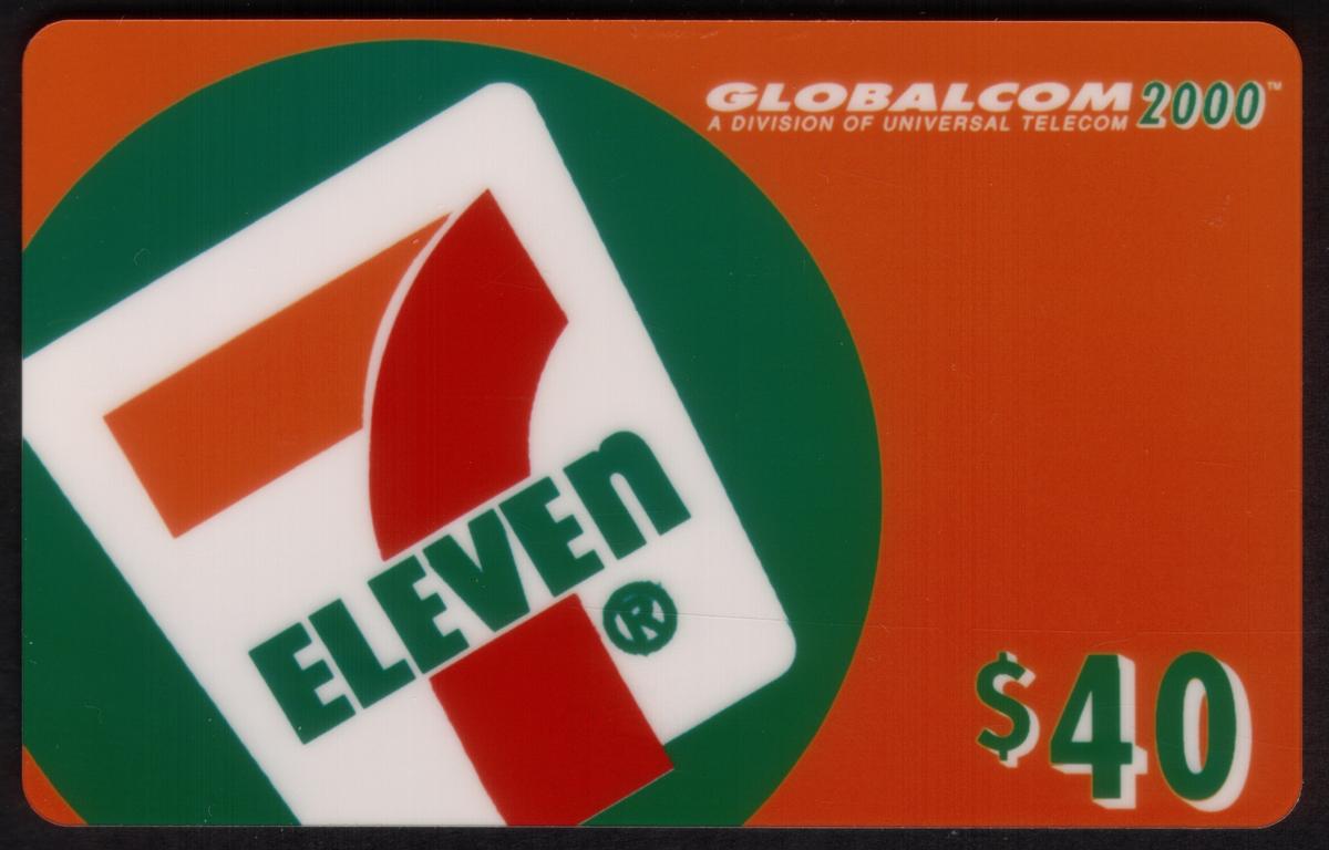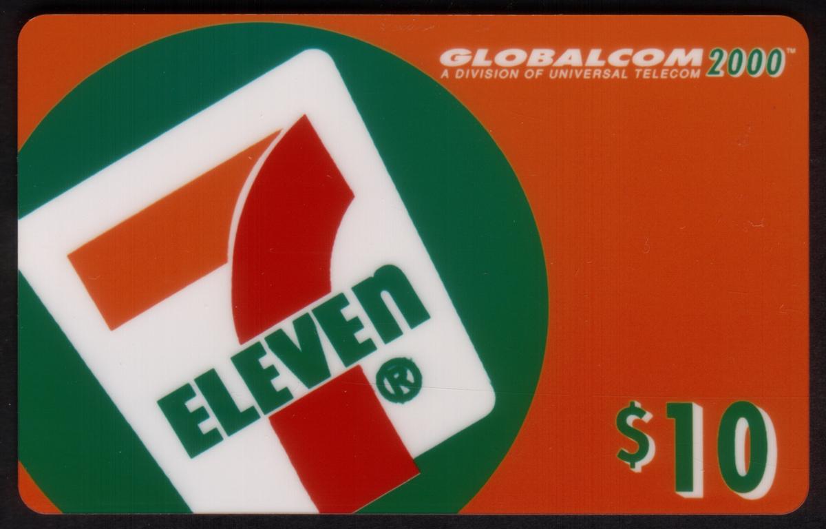 Set of four 7-Eleven branded phone cards featuring the logo, denomination, and Globalcom 2000 branding, with vibrant orange backgrounds and modern design. |