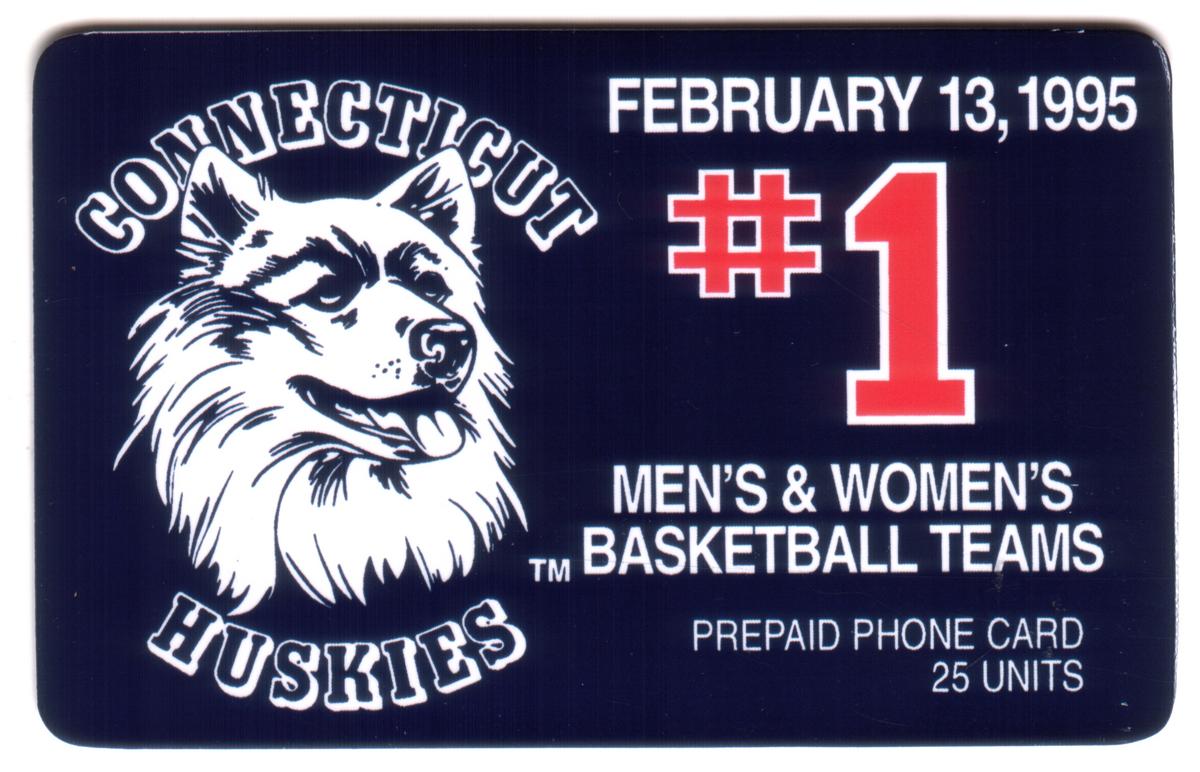 This collectible phone card features imagery related to the University of Connecticut Huskies basketball teams from 1995, showcasing both the men's and women's squads. The card prominently includes the official UConn Huskies logo and represents the Connecticut Huskies as a sports theme centered on basketball. The design celebrates the university’s athletic programs, with an emphasis on basketball, indicated by the presence of basketball-related graphics and the inclusion of the Huskies mascot.