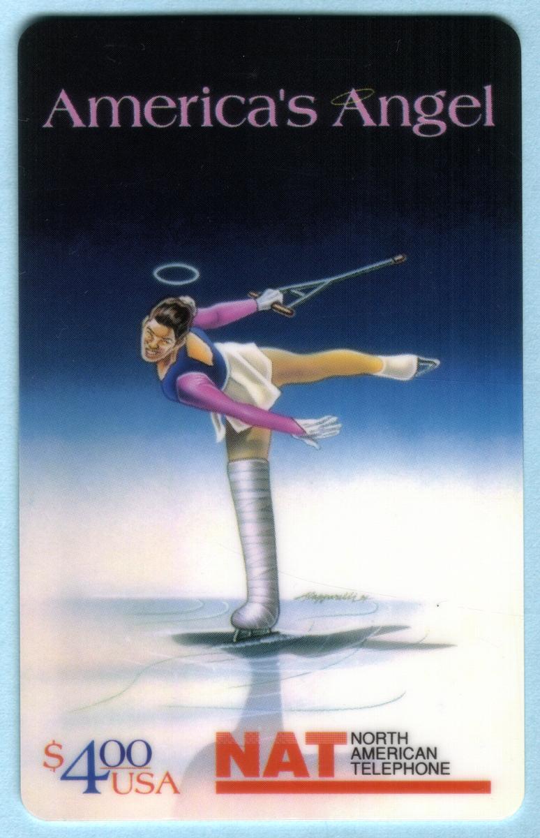 This collectible phone card features an artistic cartoon depiction of Nancy Kerrigan, the American figure skater. The image captures her gracefully skating despite a broken leg, referencing the well-known incident during the figure skating championships. Nancy Kerrigan is shown wearing a blue skating outfit, skating on an ice rink. The background features soft, light blue shades that emphasize the ice surface and create a sense of motion and elegance. The text on the card includes “America’s Angel” emphasizing her resilience and iconic status in the sport.