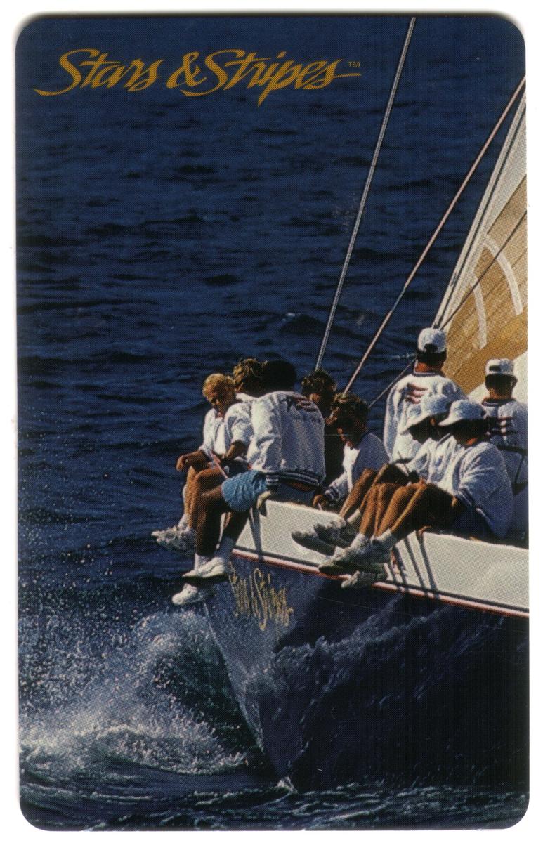 At the top left corner of the card, the text "Stars & Stripes" is beautifully rendered in gold script. The boat’s hull is a glossy dark color with a visible, stylized signature or mark in gold near the bow. Several rigging lines and the angled mainsail are visible on the right side of the image, emphasizing the dynamic nature of sailboat racing.